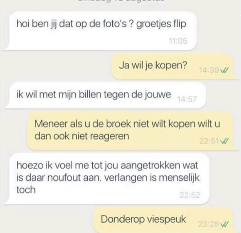Een verkoper zet netjes een broek online, maar krijgt in plaats van serieuze biedingen een berichtje van “Flip”, die vooral met zijn billen tegen die van een ander wil zitten. Als hij daarna een afwijzing krijgt, verdedigt hij zichzelf met: “Verlangen is menselijk toch?” Tja Flip, maar niet op Marktplaats.