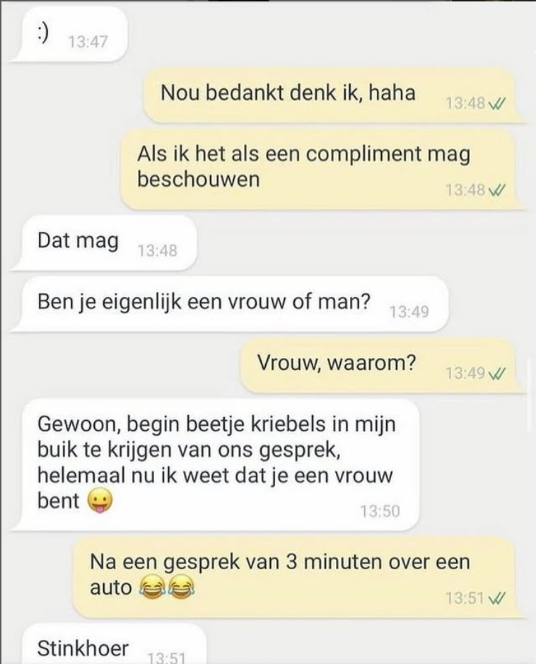 Om een truitje beter te verkopen stuurt de verkoper een foto van zichzelf met het kledingstuk. De koper ziet dat als aanleiding voor een stortvloed aan complimenten en eindigt met de vraag: “Ben je toevallig lesbisch?” Eh… waarom is dat relevant voor een topje?