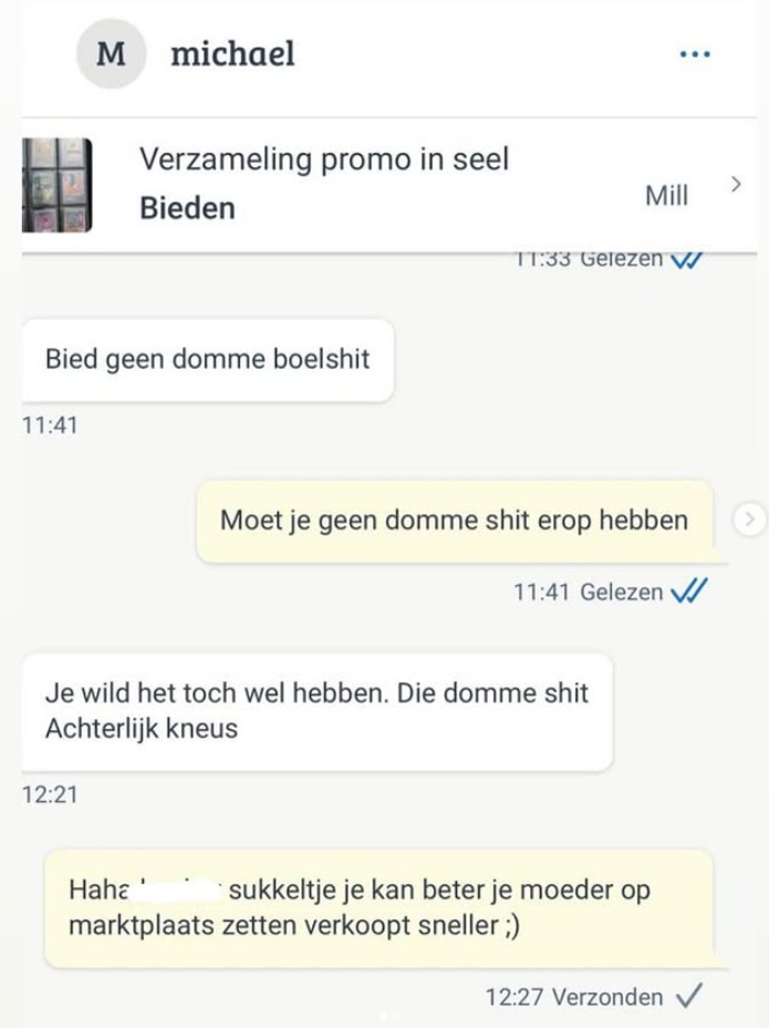 Een verzamelaar plaatst wat spullen online en krijgt direct de reactie: “Bied geen domme boelshit.” Het gesprek ontaardt in scheldpartijen, tot de verkoper afsluit met: “Zet je moeder op Marktplaats, die verkoopt sneller.” Touché.