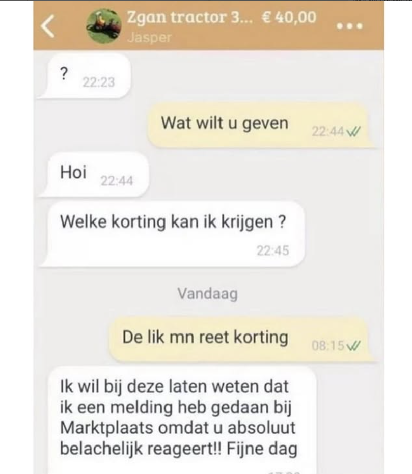 Een koper vraagt netjes of er korting mogelijk is. Het antwoord? “De lik m’n reet korting.” De koper meldt de verkoper prompt bij Marktplaats. Moraal van het verhaal: soms is zwijgen écht goud.