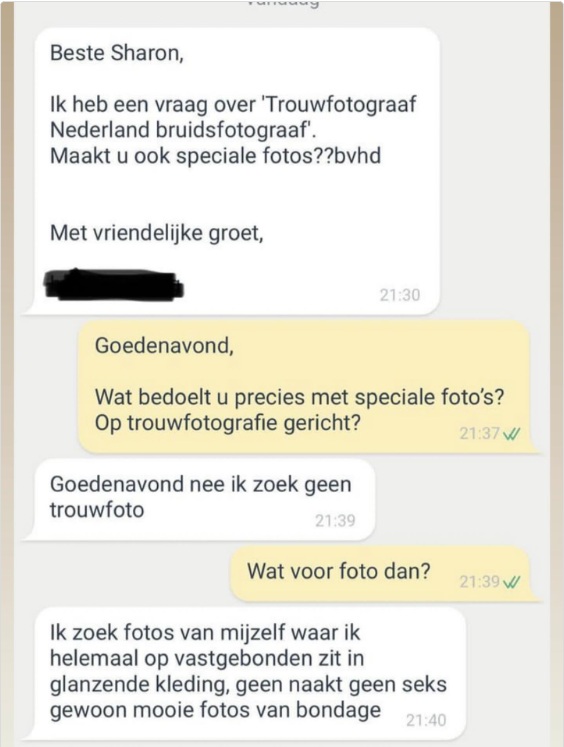 Een fotograaf krijgt een berichtje van iemand die informeert naar “speciale foto’s”. Dat klinkt onschuldig… tot blijkt dat de beste man geen trouwfoto’s bedoelt, maar vastgebonden bondage-shoots in glanzende kleding. Ehm… verkeerde website misschien?