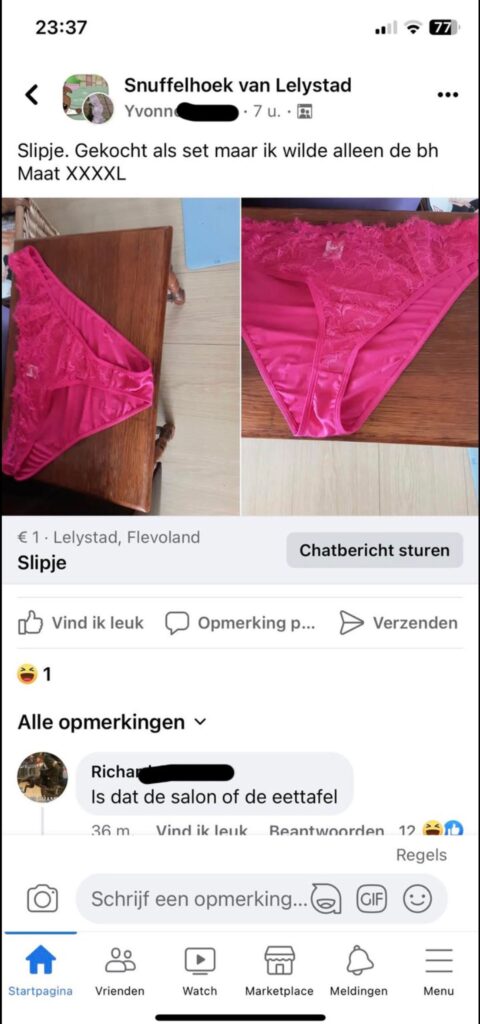 Op social media kom je dagelijks van alles tegen, maar sommige Facebook berichten slaan echt alles. In verschillende groepen en op Marktplaatsachtige pagina’s delen mensen soms advertenties of posts die zo vreemd zijn dat ze meteen viral gaan. Een goed voorbeeld daarvan is een bericht waarin iemand een slipje aanbiedt dat eigenlijk onderdeel was van een set. Volgens de tekst wilde de verkoper alleen de bh houden en daarom werd het andere kledingstuk los aangeboden. Wat het nog opvallender maakt, is dat het item gewoon op tafel is gefotografeerd en voor een symbolisch bedrag van één euro wordt aangeboden. Dit soort Facebook berichten zorgen vaak voor veel reacties, omdat mensen niet goed weten of het serieus bedoeld is of niet. Daardoor ontstaan er al snel grappige opmerkingen onder de post.