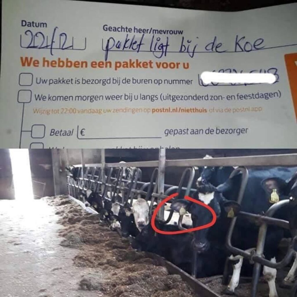 Sommige afleverlocaties zijn simpelweg briljant. Een boer vond een PostNL-briefje waarop stond dat zijn pakket “bij de koe” lag. En inderdaad: tussen de nieuwsgierige koppen van de dieren in de stal stak een doos uit. Het beeld ging razendsnel viral, en eerlijk is eerlijk: deze bezorger verdient punten voor originaliteit. Het pakket kwam immers veilig aan, ook al was het niet bepaald wat de ontvanger had verwacht.