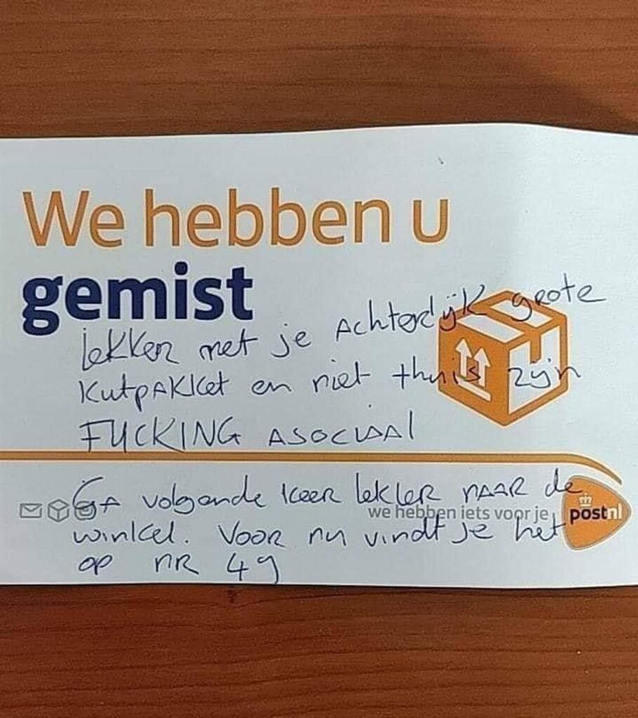 Iedereen kijkt uit naar een pakketje, maar soms lopen dingen nét wat anders dan gepland. Pakketbezorgers hebben een van de zwaarste en meest hectische banen van dit moment, en dat levert vaak hilarische, soms frustrerende situaties op. Van creatieve afleverplekken tot boodschappenbriefjes waar je hardop om moet lachen: dit zijn 25 momenten waarop pakketbezorgers duidelijk even klaar waren met alles.