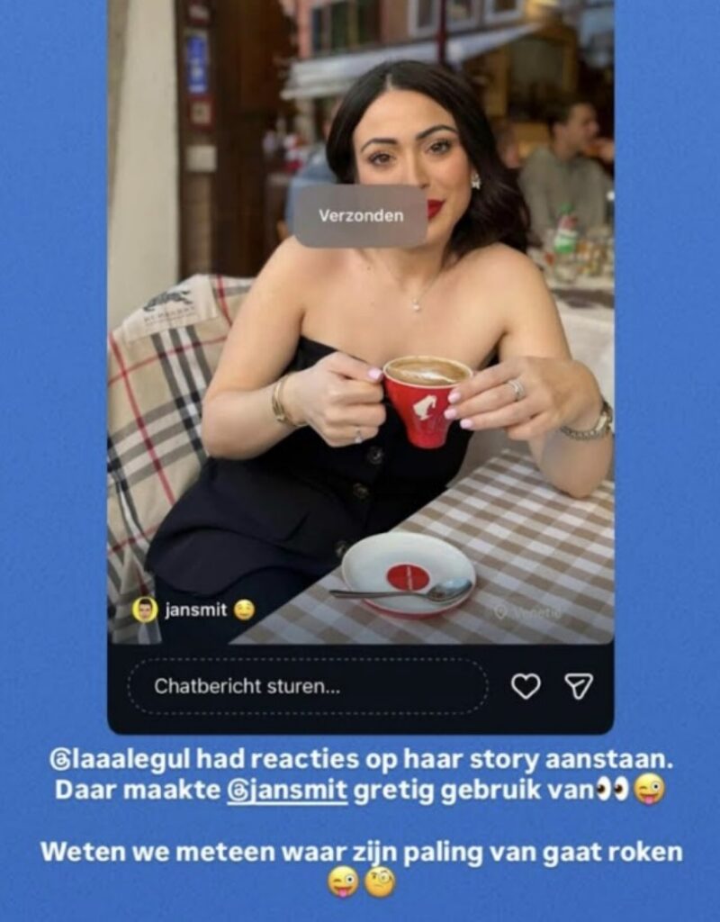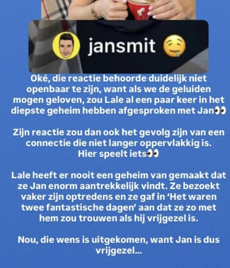 Een onverwachte online actie van Jan Smit zorgt voor flink wat rumoer. De zanger, die recent weer vrijgezel is, kwam in de spotlights te staan nadat hij reageerde op een social media-post van Lale Gül. Zijn reactie, een kwijlende emoji, werd publiek zichtbaar en ging al snel rond op internet. Nu worden de geruchten dat de twee elkaar leuk vinden aangewakkerd door een nieuwe foto van Lale.