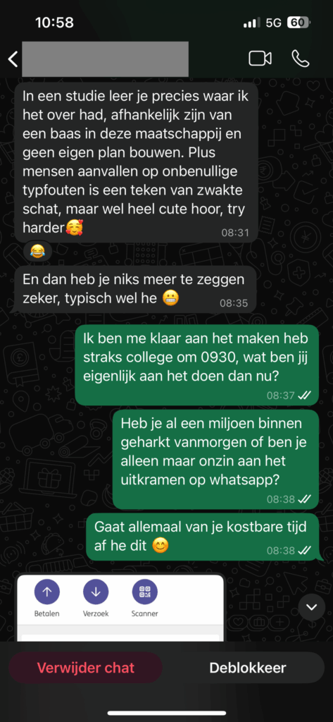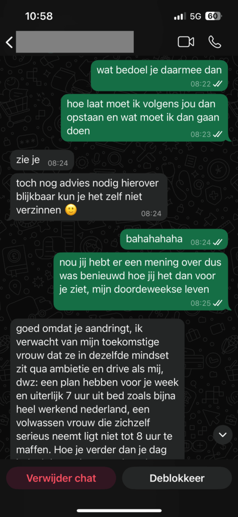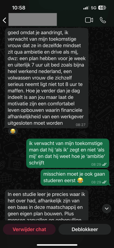 Een zogenoemde Andrew Tate wannabe zorgt online voor discussie nadat screenshots van een chatgesprek werden gedeeld waarin hij probeert indruk te maken met een afbeelding van zijn bankrekening. In het gesprek benadrukt de Andrew Tate wannabe herhaaldelijk dat “mindset” en financiële ambitie bepalend zijn voor succes en relaties. Ook stelt hij dat een toekomstige partner hetzelfde niveau van discipline moet hebben. Verder probeert hij de ander te overtuigen met uitspraken over toewijding, productiviteit en toekomstplannen.