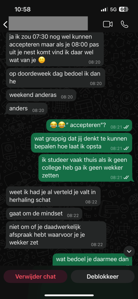 In de berichten uit de Andrew Tate wannabe ook kritiek op tijdsbesteding en studiekeuzes van de ander. Daarbij suggereert hij dat succes vooral afhangt van “de juiste mentaliteit”. Daarbij zou hij zelfs hebben gedreigd om het gesprek te beëindigen of de ander te blokkeren wanneer zijn adviezen niet werden opgevolgd. Veel gebruikers herkennen hierin gedrag dat ze associëren met online succescoaches die zich laten inspireren door figuren zoals Andrew Tate.