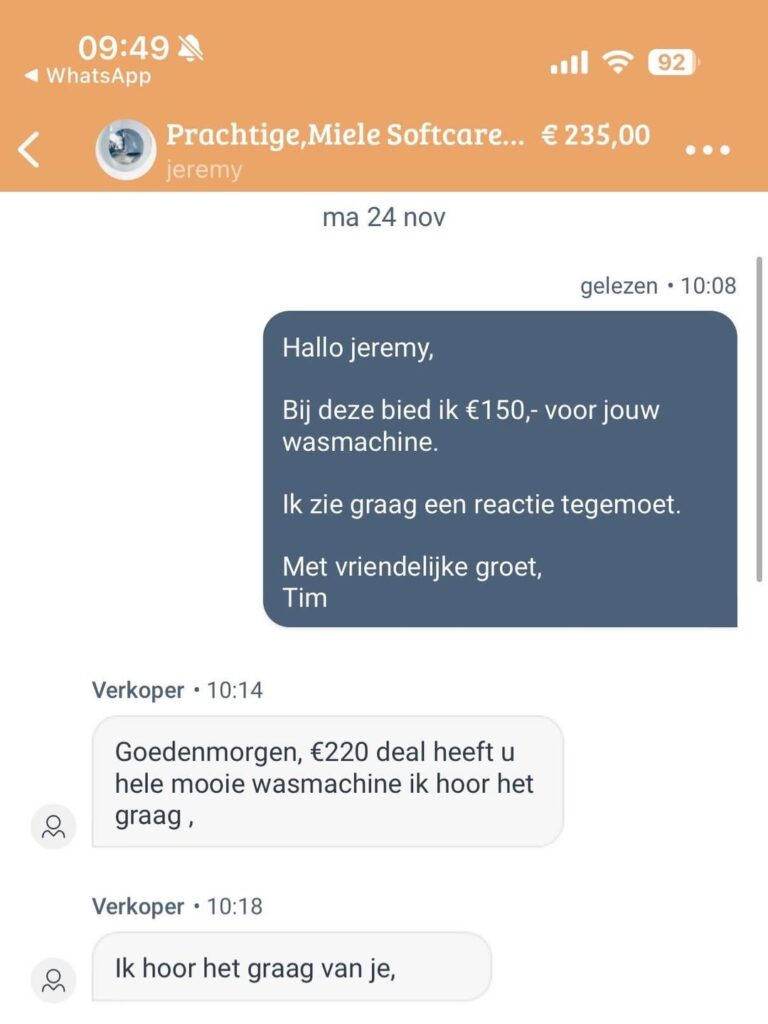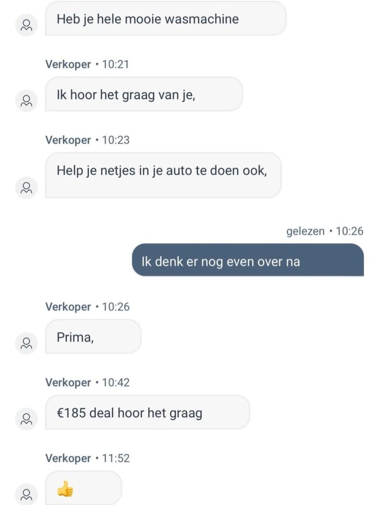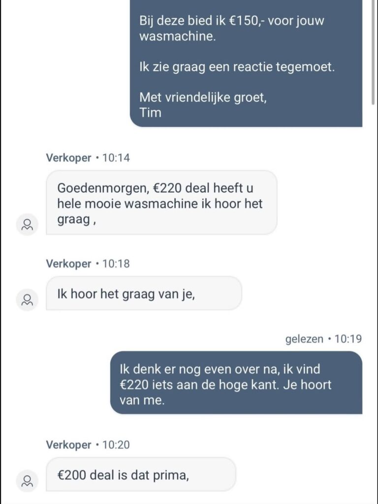 Het begon allemaal zo netjes. Tim stuurde een keurig bericht om een Marktplaats wasmachine op te halen voor €150, compleet met vriendelijke groet en alles. De verkoper reageerde vrijwel direct — misschien zelfs iets té direct — met hogere tegenbiedingen, herhalingen, en zo nu en dan een aanmoedigende “ik hoor het graag”. Wat normaal een rustig heen-en-weer had moeten zijn, veranderde langzaam in een soort improvisatietheater waarin de verkoper steeds opnieuw de scène betreedt om dezelfde zin nog eens te spelen.