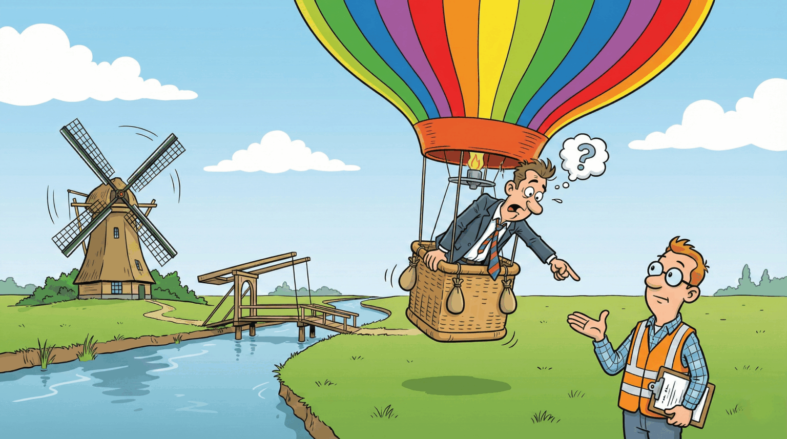 Een man vaart met een luchtballon boven een weiland ergens in Nederland, maar heeft geen idee meer waar hij is.Hij…