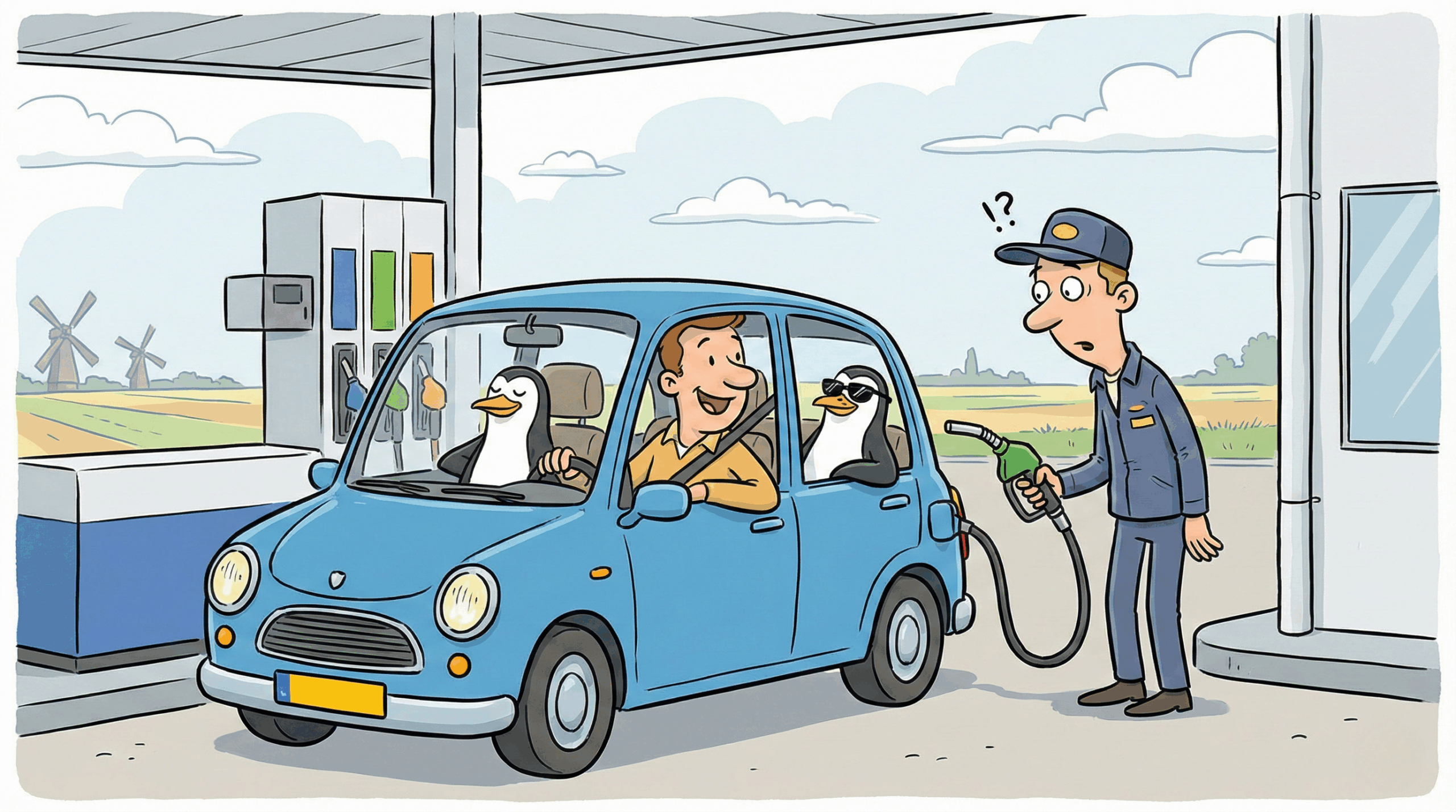 Een man rijdt met zijn auto een tankstation langs de snelweg op, ergens tussen Utrecht en Amersfoort. Terwijl de pompbediende…