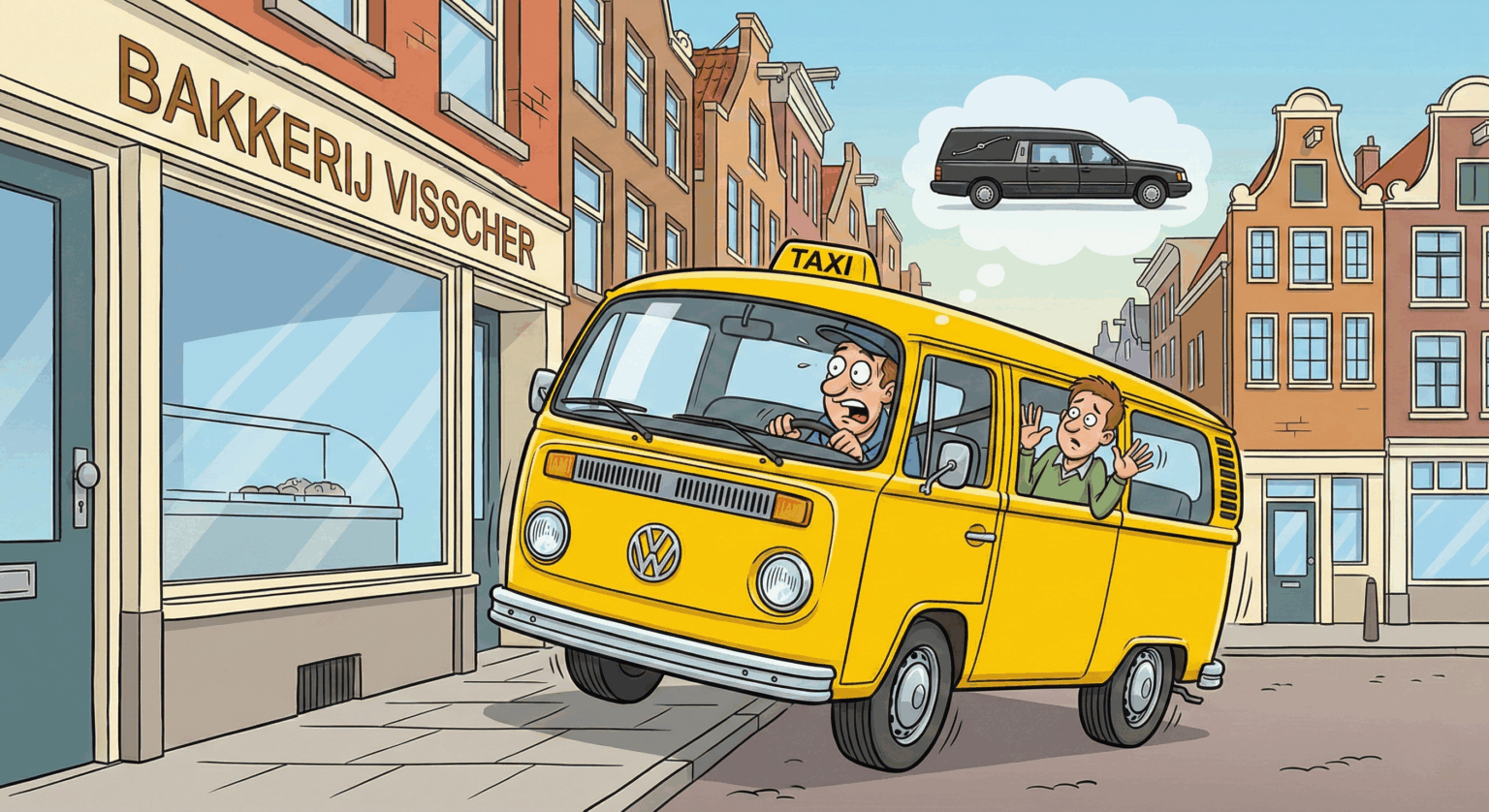 Een man zit achterin een taxi in het centrum van de stad.Hij tikt de chauffeur zachtjes op zijn schouder om…