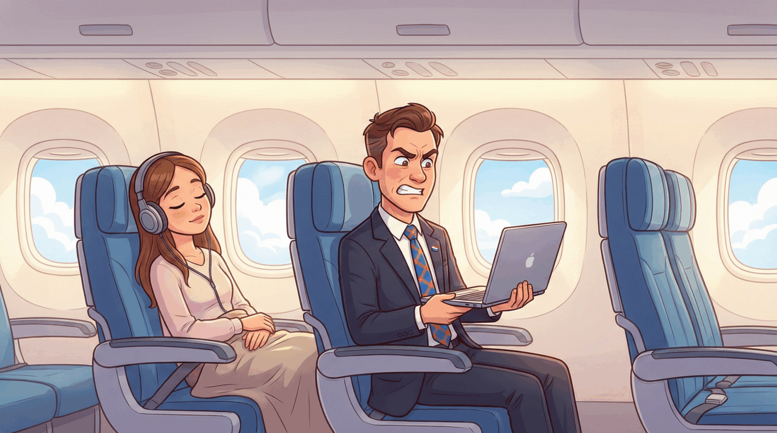 Een vrouw en een Nederlandse advocaat zitten naast elkaar in een vliegtuig van Schiphol naar Barcelona. De vrouw is moe…
