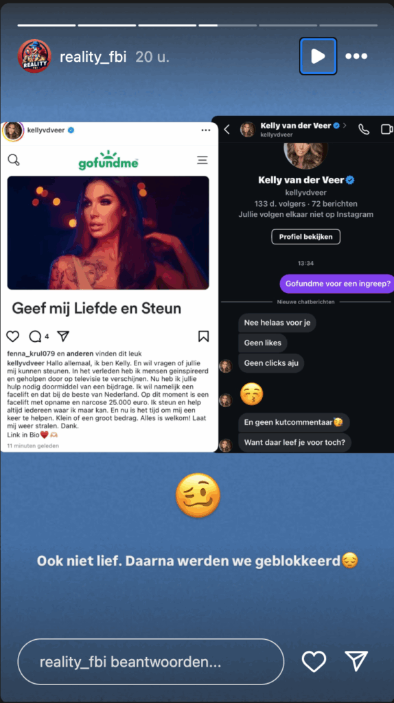 Het bekende juicekanaal Reality_FBI pikte de actie van Big Brother Kelly snel op en wist zelfs een DM-gesprek met haar te voeren. Toen zij vroegen of de GoFundMe-pagina echt bedoeld was voor een cosmetische ingreep, reageerde Big Brother Kelly fel en defensief. Ze verwees kritische vragen direct naar de prullenbak met uitspraken als: “Geen likes. Geen clicks aju. En geen kutcommentaar.” Kort na het gesprek blokkeerde ze het kanaal, wat opnieuw voer was voor de roddelpers.