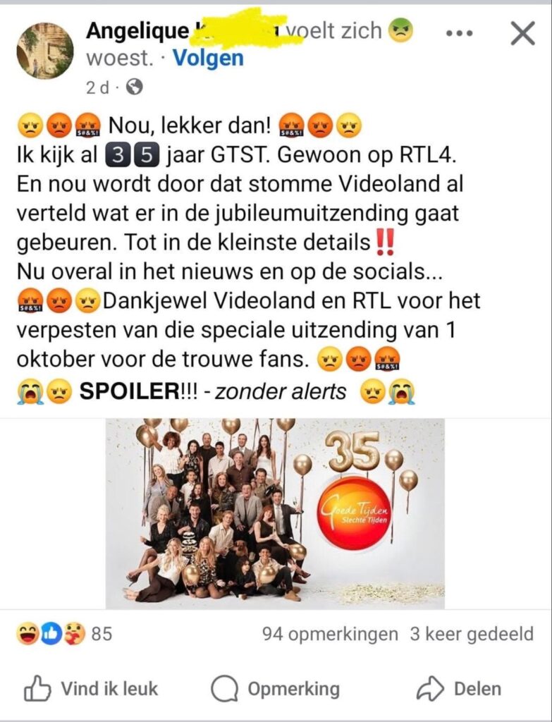 GTST, oftewel Goede Tijden, Slechte Tijden, is de langstlopende soap van Nederland en al sinds 1990 op televisie. Het geheim van het succes zit vaak in de cliffhangers, onverwachte wendingen en het feit dat kijkers jarenlang meegroeien met hun favoriete personages. Spoilers kunnen die beleving volledig verpesten, zeker voor kijkers die altijd op RTL4 afstemmen en bewust wachten op de lineaire uitzending. Sommige fans kunnen de soapserie daardoor misschien zelfs iets t’e serieus gaan nemen, zoals ene Angelique, die haar frustraties de vrije loop laat op Facebook.