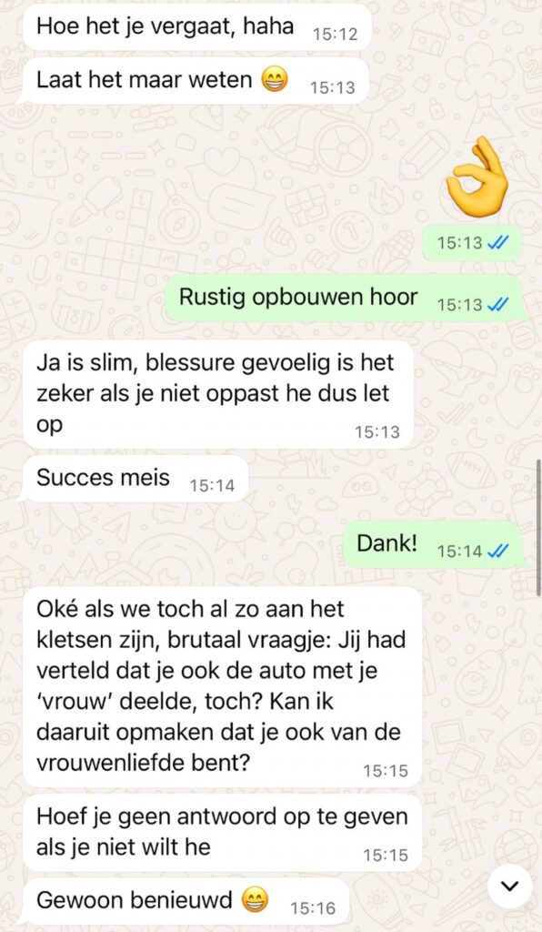 De sfeer slaat plots om wanneer de verkoper overgaat tot een “brutaal vraagje”. Hij suggereert op een ongelukkige manier dat zijn koper mogelijk op vrouwen valt, puur omdat ze de auto zou delen met haar ‘vrouw’. Wat een luchtig gesprek had kunnen blijven, ontspoort in een ongemakkelijk en beschuldigend betoog. De verkoper beweert ineens dat ze “veel problemen gaan krijgen” en besluit eenzijdig dat er geen afspraak meer zal volgen. Zijn opmerkingen over gelijkwaardigheid in relaties en het “niet gunnen” laten vooral zien dat deze mislukte flirtpoging meer zegt over hem dan over zijn koper.