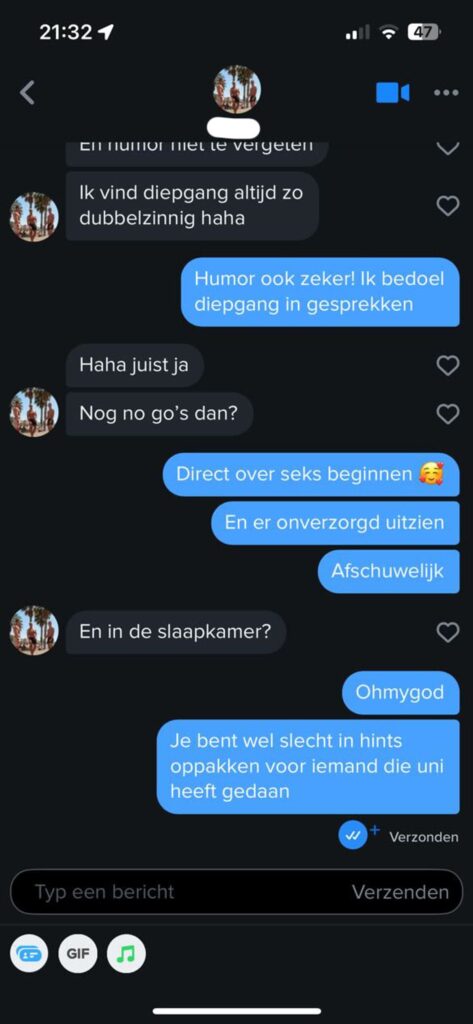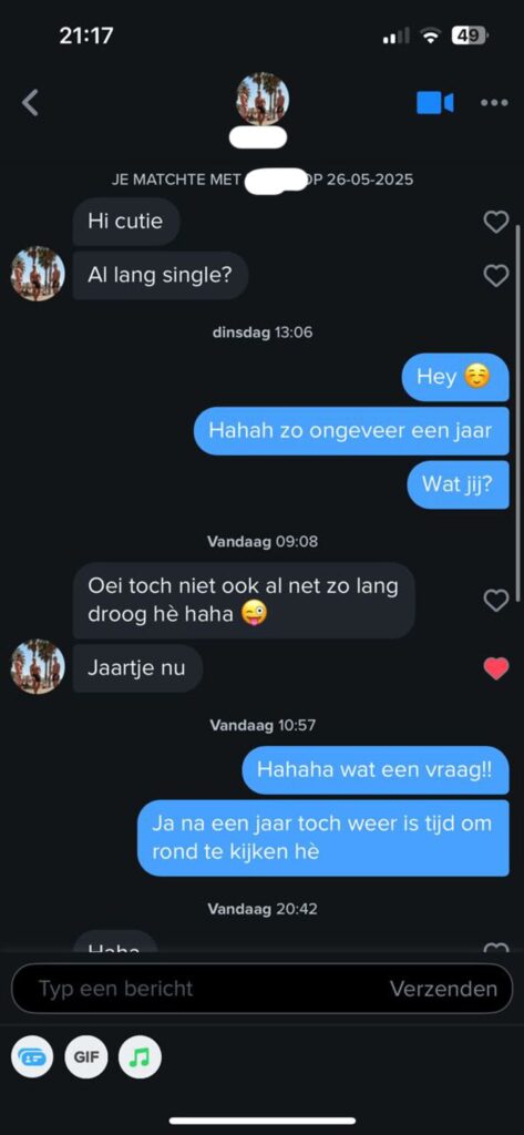 Het begon nog redelijk normaal. Een simpele “Hi cutie” en wat luchtig geklets over hoe lang ze al single waren. Maar het gesprek nam al snel een rare wending toen hij zonder blikken of blozen vroeg of ze “ook al net zo lang droog” was. De dame probeerde het nog luchtig te houden met wat humor, maar de toon was gezet. Terwijl zij probeerde het gesprek een beetje inhoud te geven, bleef hij hangen in ongemakkelijke flirtpogingen en rare grapjes. Het is zo’n moment waarop je denkt: dit is precies waarom Tinder gesprekken zo vaak fout lopen.