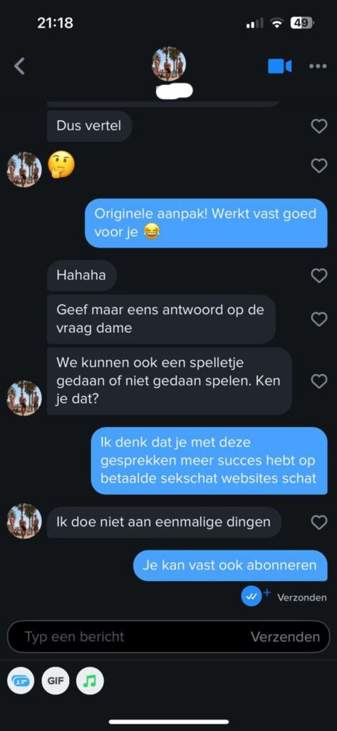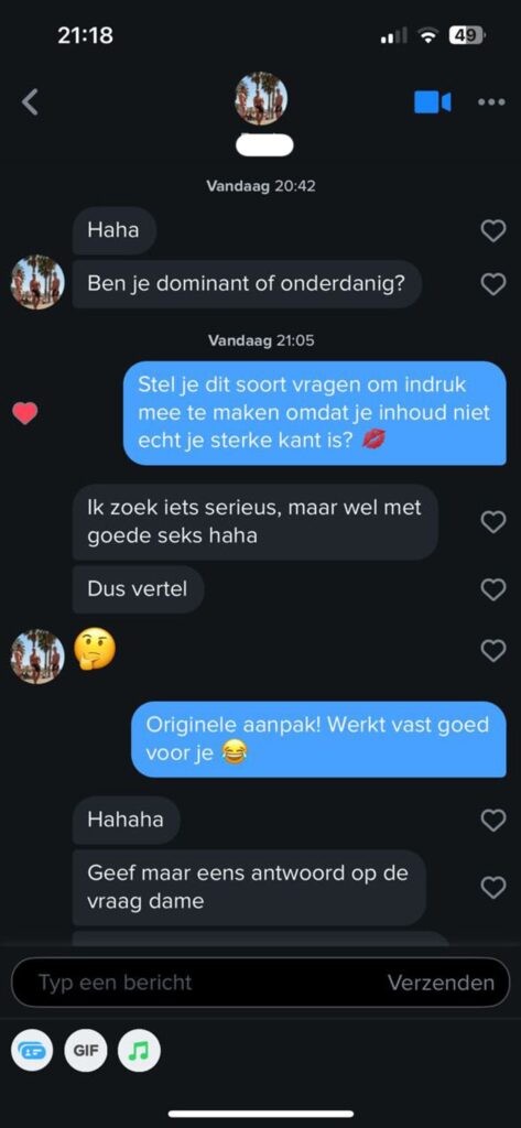 Alsof het nog niet erg genoeg was, begon hij plots over dominantie en onderdanigheid. Toen zij hem subtiel probeerde af te remmen met de opmerking dat inhoud niet zijn sterke kant leek te zijn, ging hij gewoon verder. “Ik zoek iets serieus, maar wel met goede seks haha,” schreef hij, gevolgd door het voorstel om een “gedaan of niet gedaan”-spelletje te spelen. Haar reactie was scherp: “Ik denk dat je met deze gesprekken meer succes hebt op betaalde sekschat-websites.” Toch leek dat niet door te dringen, want de man bleef aandringen alsof hij auditie deed voor de meest ongemakkelijke date van het jaar.
