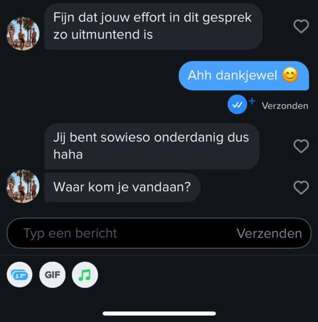 De laatste berichten waren bijna pijnlijk om te lezen. Terwijl zij duidelijk liet merken geen interesse te hebben, bleef hij doordrammen met zinnen als “Jij bent sowieso onderdanig dus haha.” Zijn gebrek aan zelfinzicht was op dat moment bijna bewonderenswaardig. Haar droogkomische reacties (“Fijn dat jouw effort in dit gesprek zo uitmuntend is”) maakten de situatie alleen maar pijnlijker — en grappiger voor iedereen die het later teruglas.