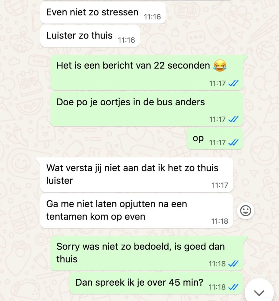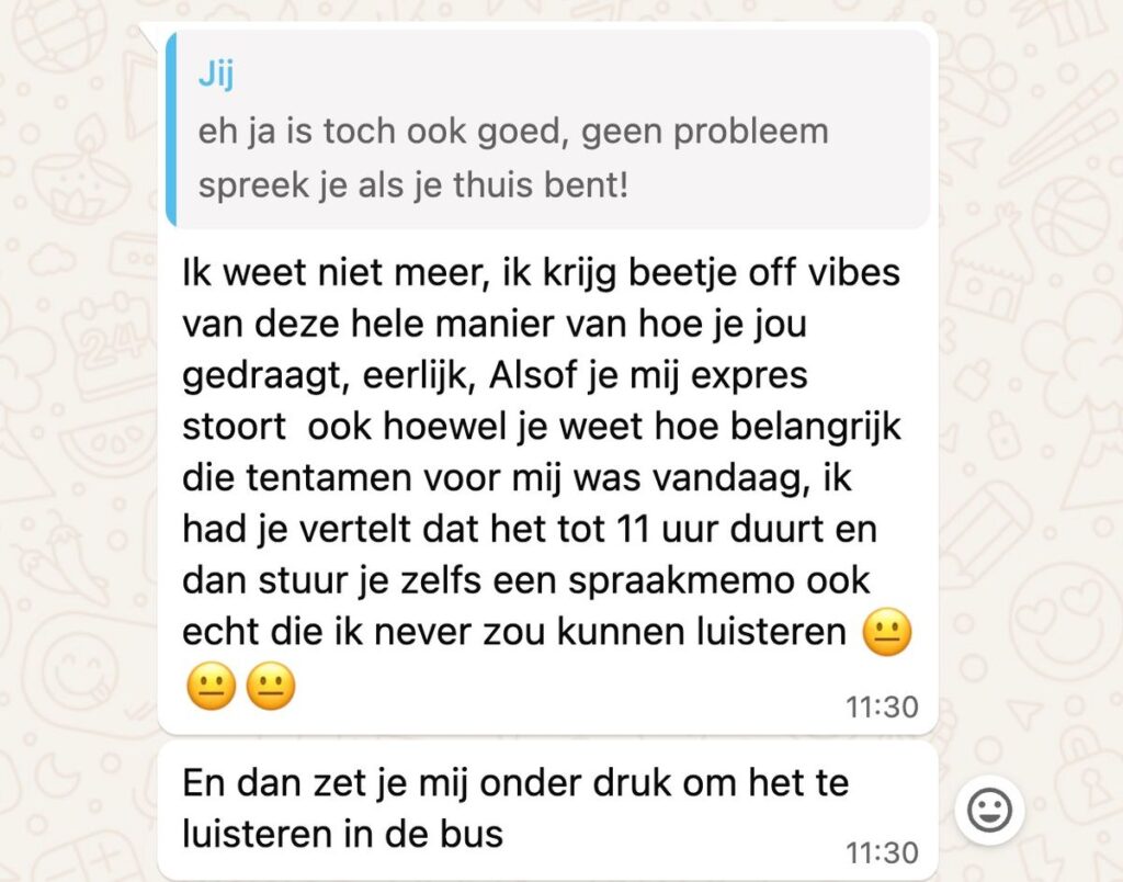 Een onschuldig voice-appje kan soms meer losmaken dan verwacht, zo blijkt uit een recente chat tussen een jong stel. Wat begon als een kort berichtje om elkaar succes te wensen tijdens een tentamen, escaleerde snel. De ontvanger voelde zich onder druk gezet door de constante vragen over reistijd en timing. Voor buitenstaanders lijkt het klein, maar voor degene die het bericht ontving, bleek dit een duidelijke red flag in het gedrag van de date.