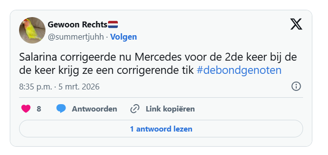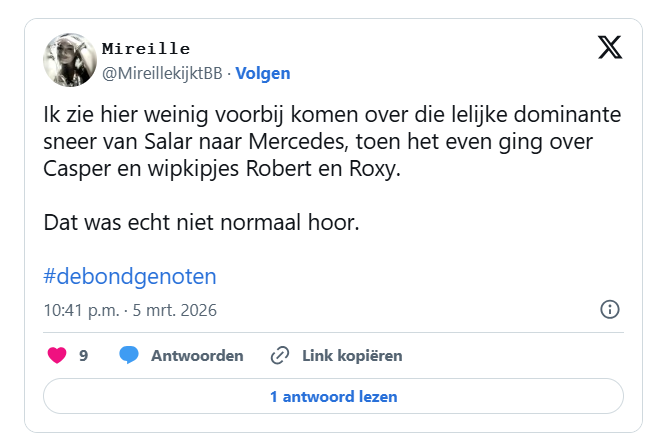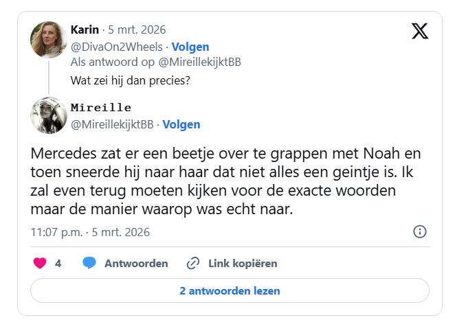 Het incident laat zien hoe snel een persoonlijk gesprek in De Bondgenoten kan veranderen in een moment dat veel kijkers bezighoudt. Doordat de discussie plaatsvond waar andere deelnemers bij waren, vonden veel fans dat Mercedes onnodig voor schut werd gezet.