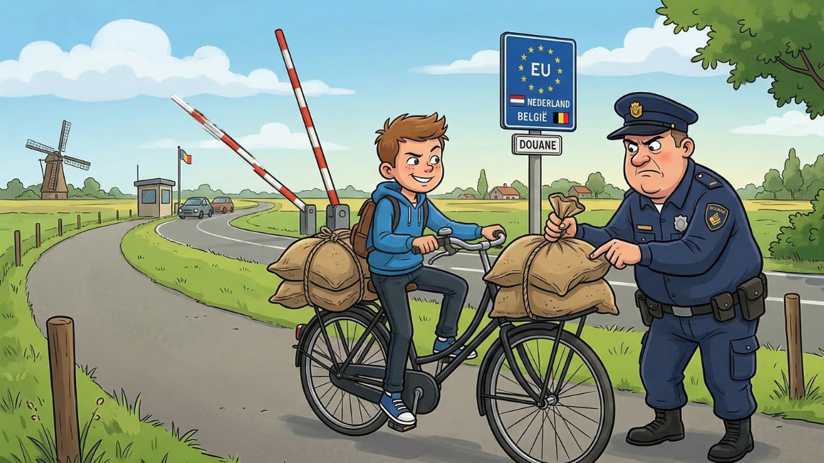 Op een doordeweekse ochtend fietst een Nederlands jongetje met twee grote jute zakken op z’n bagagedrager richting België.Bij de grens…
