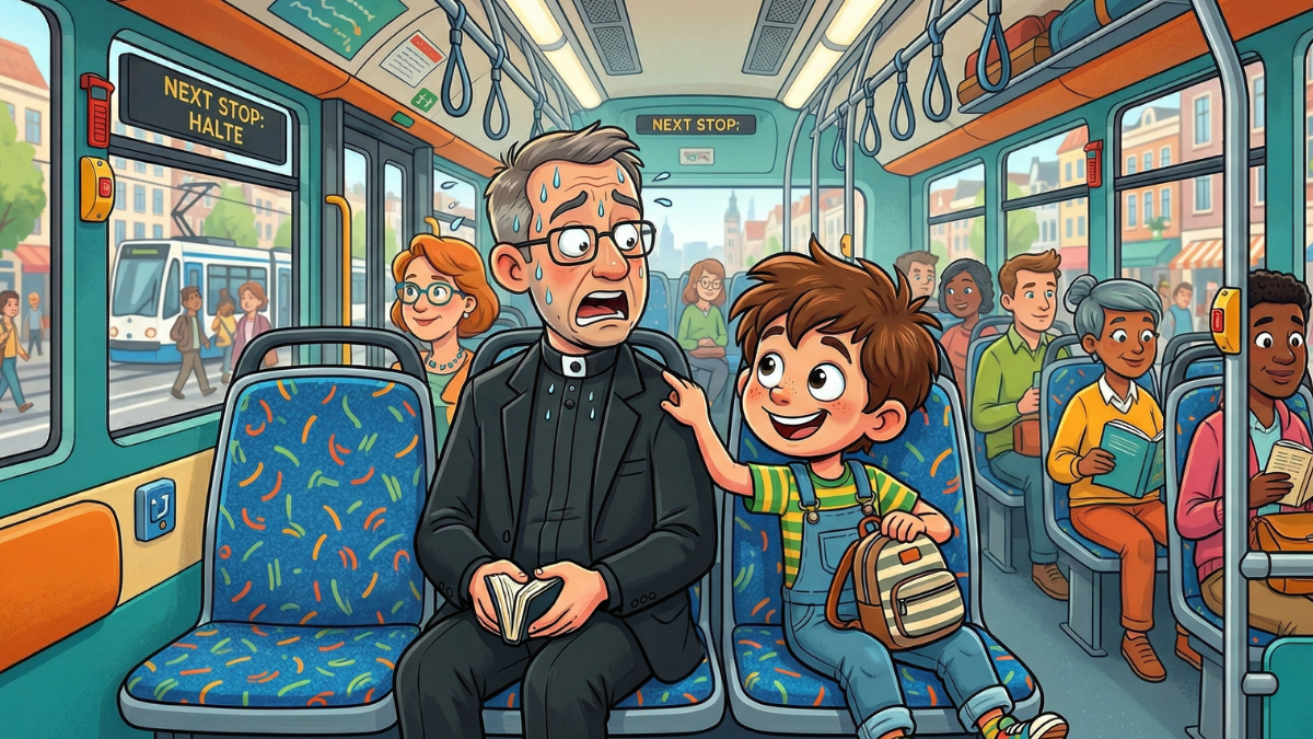 Een jongetje stapt in de bus en gaat naast een man zitten die een boek leest. Hij merkt dat de…