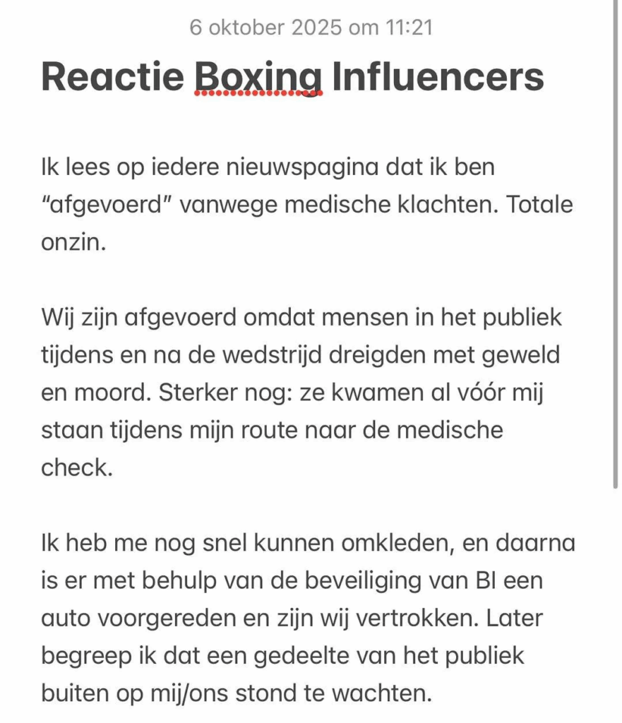 Tijdens en na het gevecht zouden er mensen in het publiek zijn geweest die hem met geweld en zelfs moord bedreigden. “Ze stonden al op mijn route naar de medische check,” legt hij uit. Volgens hem greep de beveiliging van Boxing Influencers in om te voorkomen dat de situatie uit de hand liep.