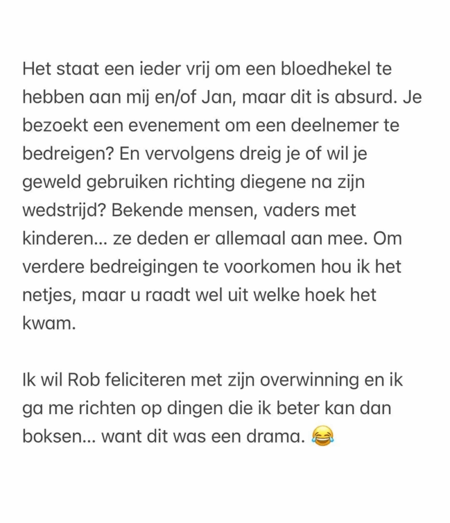 Ondanks alles blijft Dennis sportief richting zijn tegenstander Rob Goossens. Hij feliciteert hem met de winst en kan er zelfs nog een grapje over maken. “Ik ga me richten op dingen die ik beter kan dan boksen… want dit was een drama,” schrijft hij met een lach.