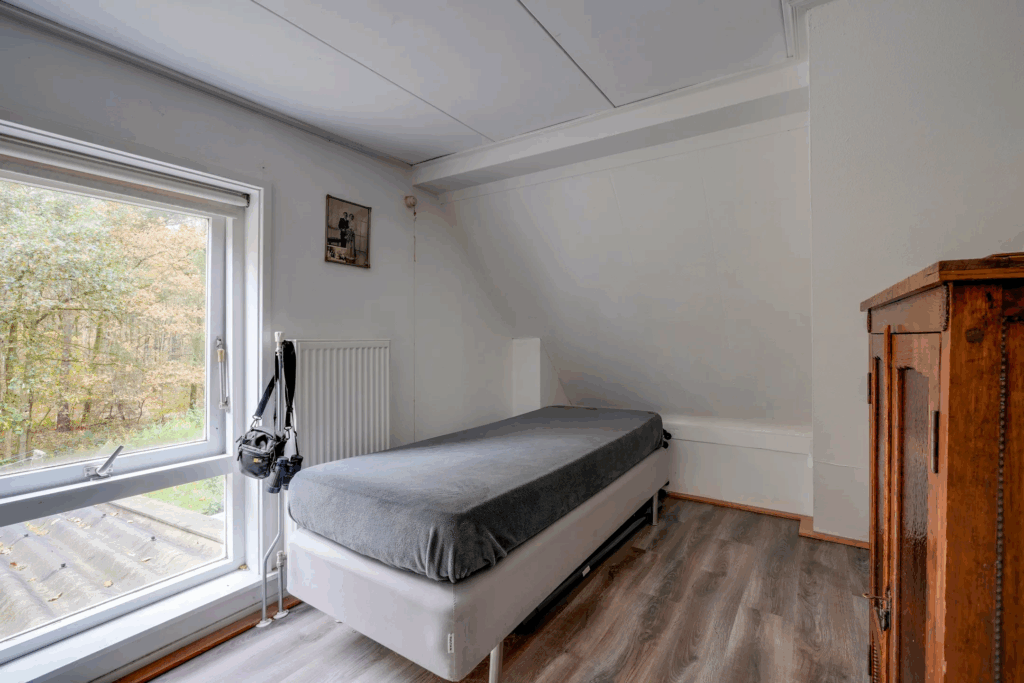 Binnen biedt de betaalbare boswachterswoning een functionele indeling die direct een warm en authentiek gevoel oproept. De woonkamer vormt het hart van het huis en wordt gekenmerkt door een houtkachel die tijdens koude dagen zorgt voor een gezellige sfeer. De aangrenzende keuken is eenvoudig maar praktisch ingericht, met voldoende mogelijkheden om deze naar eigen smaak te moderniseren. Op de eerste verdieping bevinden zich twee slaapkamers, beide voorzien van extra bergruimte, wat het huis geschikt maakt voor kleine gezinnen, stellen of mensen die een werkruimte aan huis willen creëren.