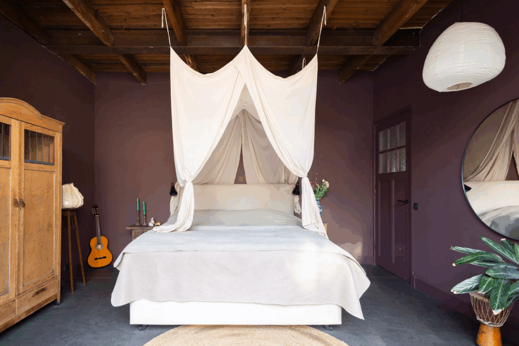 Op de verdieping bevinden zich drie royale slaapkamers en een badkamer. Zichtbare balken en bijzondere lichtinval geven ook hier een uitgesproken sfeer. De hoofdslaapkamer beschikt over openslaande deuren met uitzicht op de binnentuin.