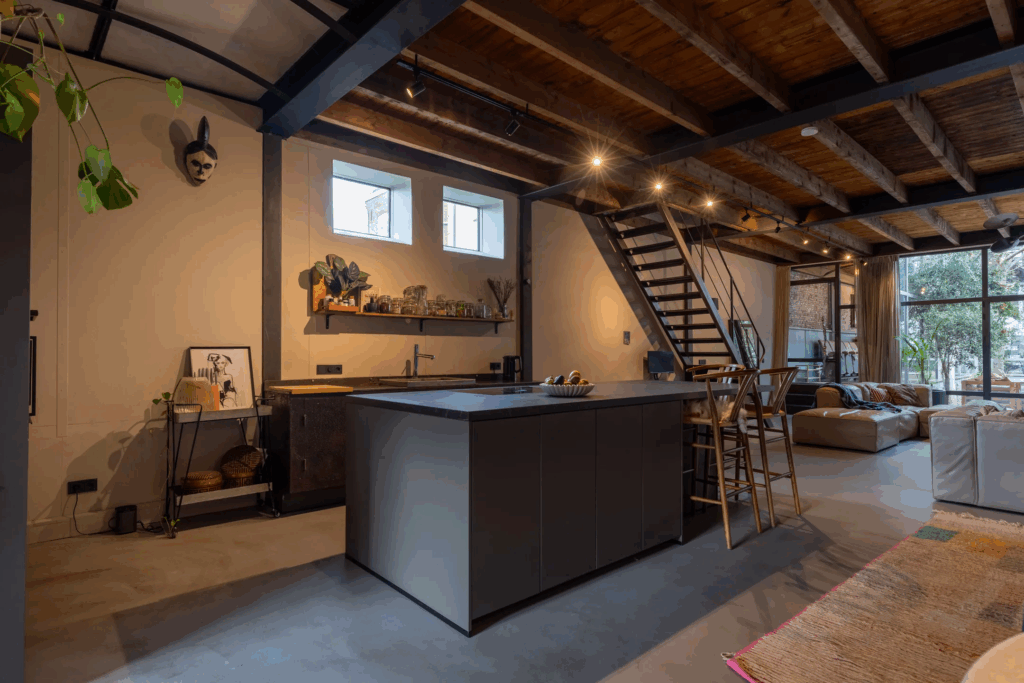 De keuken vormt het hart van deze ruimte. Het moderne eiland is uitgerust met een inductiekookplaat, oven, wijnklimaatkast en geïntegreerde koel-vriescombinatie. De afwerking sluit perfect aan bij het industriële karakter van de omgebouwde bioscoop.
