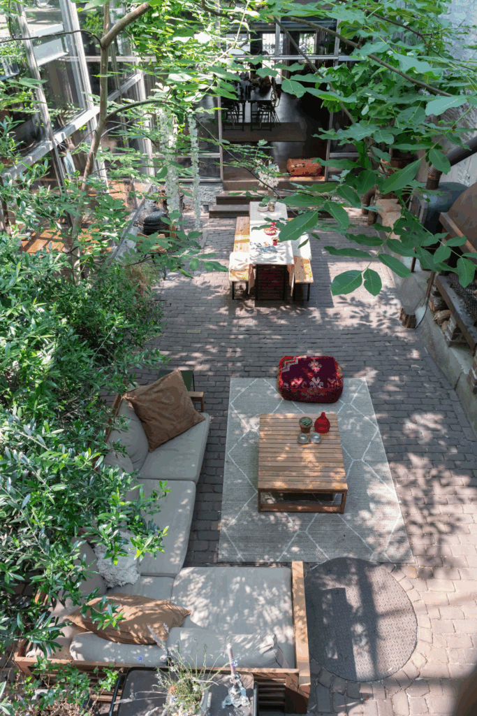 Tussen de galerie en de living ligt de overdekte binnentuin. Met een glazen dak dat geopend of gesloten kan worden, ontstaat een unieke binnen-buitenbeleving, geschikt voor elk seizoen.