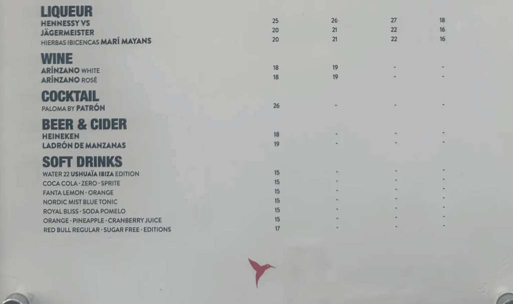 In Ushuaïa is zelfs gewoon water een luxeproduct. Een standaard flesje – dat met veel bombarie “Ibiza Edition” wordt genoemd – kost maar liefst €15. Softdrinks zoals cola of Sprite zijn net zo prijzig en een blikje Red Bull doet er nog een schep bovenop met €17. Wie denkt dat hij met frisdrank voordelig wegkomt, zal zijn rekening zien verdampen voordat het drankje op tafel staat. De drankprijzen op Ibiza maken dorst lessen bijna even duur als champagne drinken.