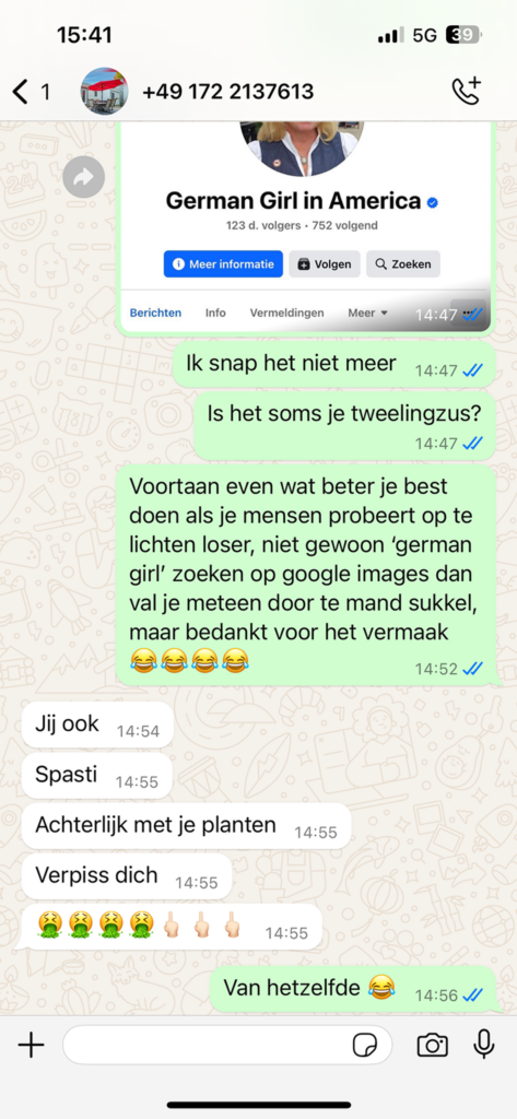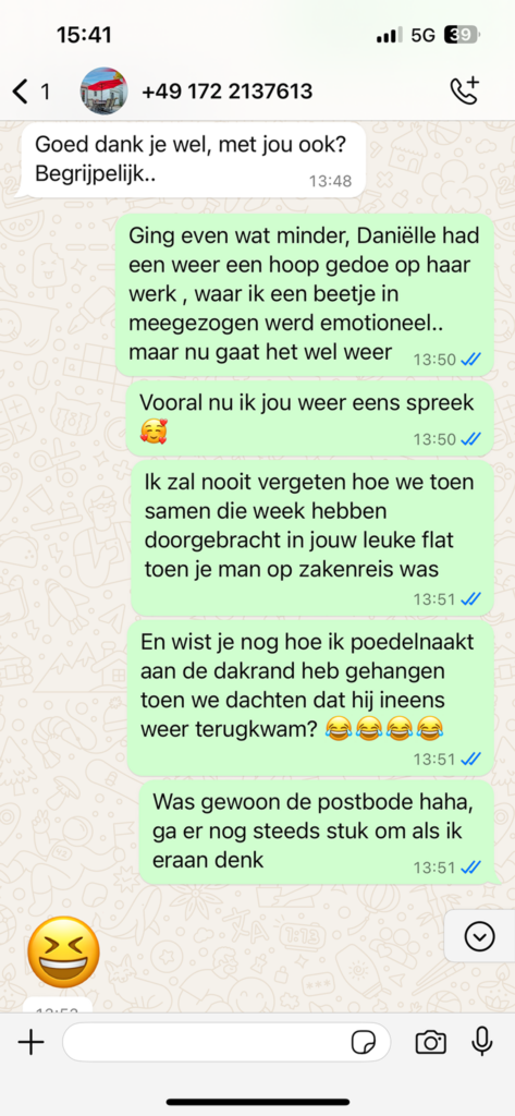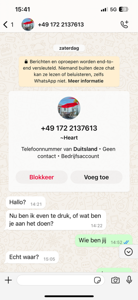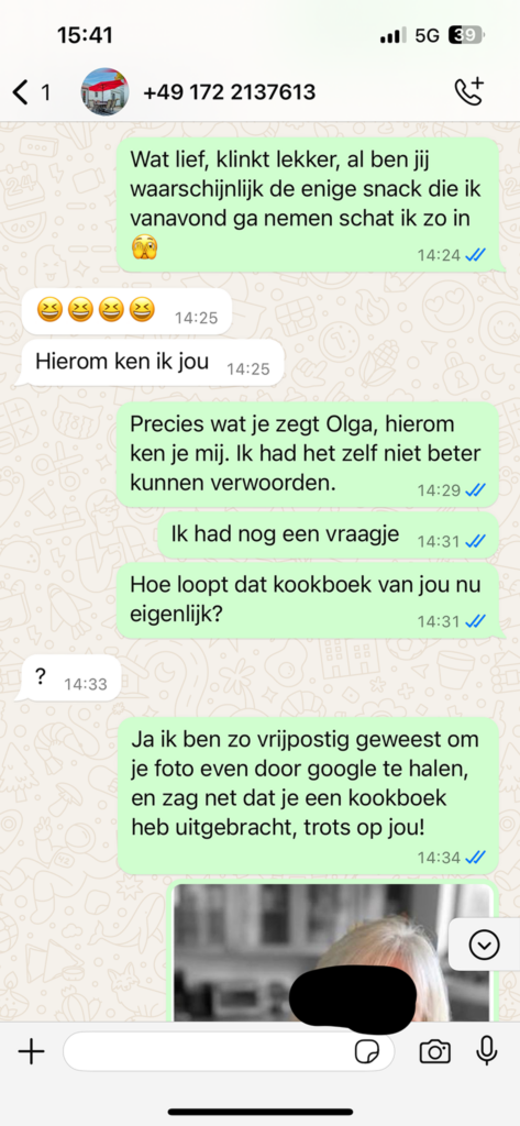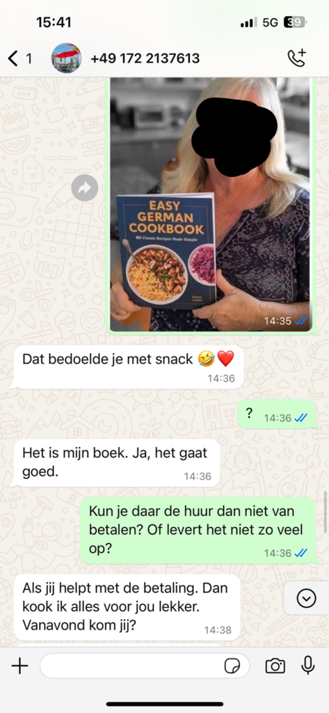 Hoewel deze situatie eindigde in een lachwekkend gesprek, laat het goed zien hoe de Duitse oplichter te werk gaat. Ze bouwen via apps zoals WhatsApp of Facebook Messenger een band op en proberen hun slachtoffers te laten geloven dat ze iemand van vroeger zijn. Pas als het vertrouwen gewonnen is, komt het échte doel naar boven: geld lospeuteren.