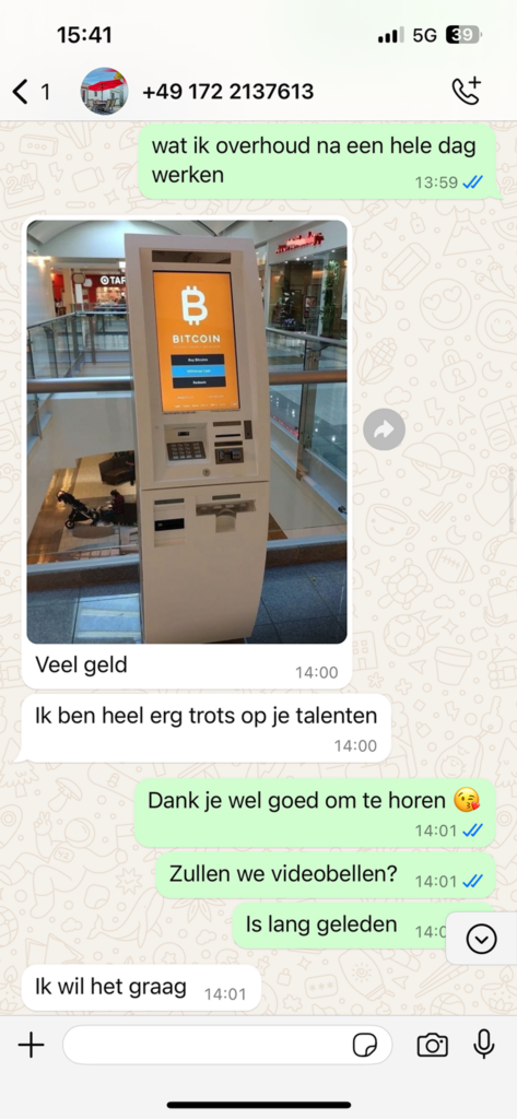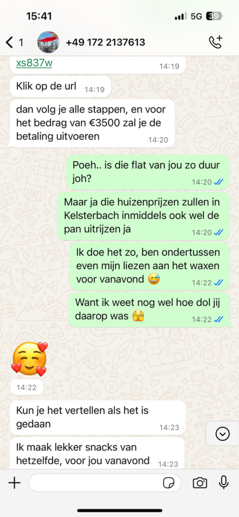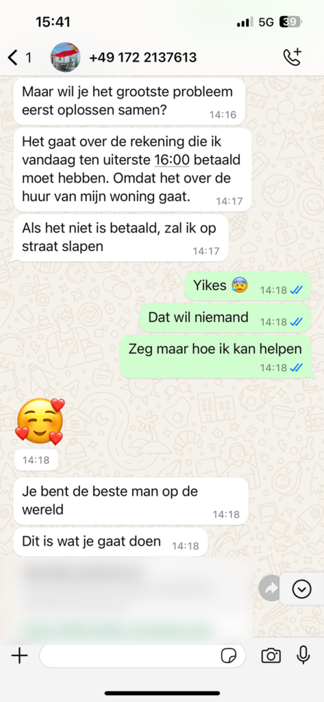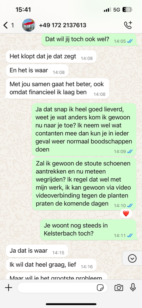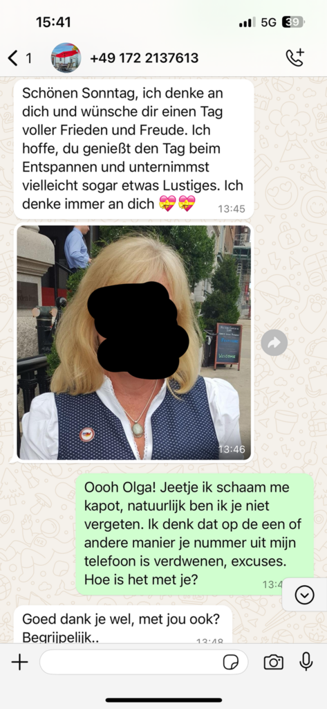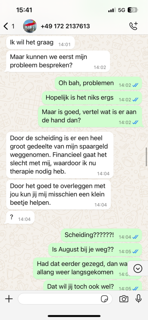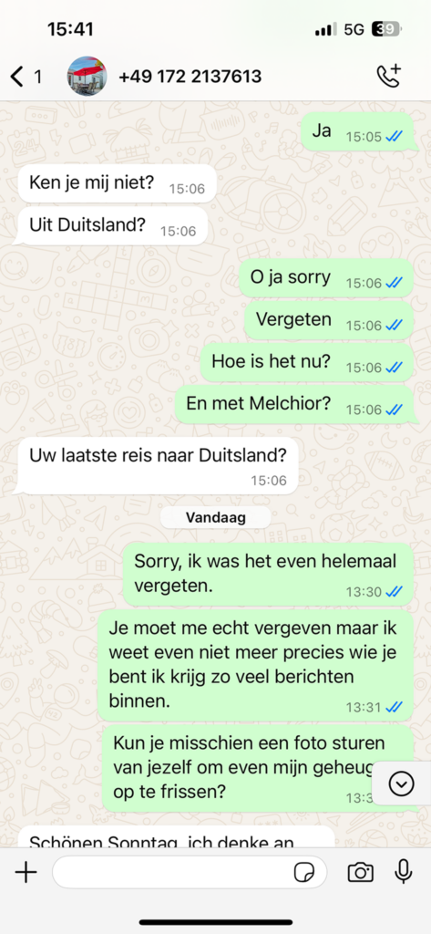 Het begint vaak simpel: een vriendelijk “Hallo?” of “Ken je mij niet meer?” — zo ook in dit geval. De Duitse oplichter presenteerde zich als een oude liefde uit Duitsland en probeerde met vage herinneringen het vertrouwen van de ontvanger te winnen. Deze aanpak is een klassieke truc binnen online oplichting, waarbij oplichters hopen dat hun slachtoffer zelf de gaten in het verhaal opvult.