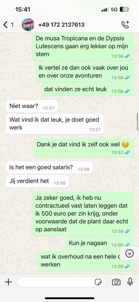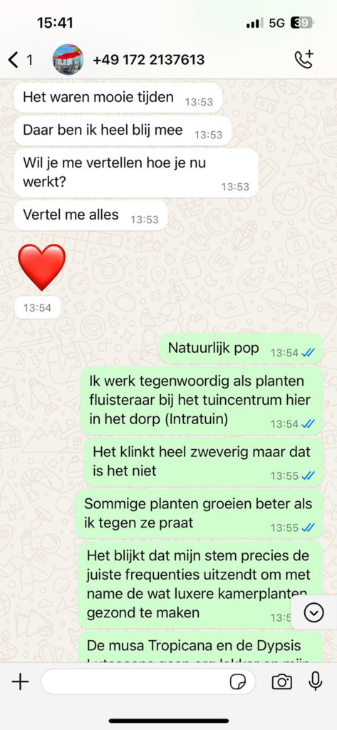In plaats van meteen argwaan te tonen, besloot de ontvanger van het bericht de Duitse oplichter op humoristische wijze te beantwoorden. Wat volgde was een fantasierijke conversatie waarin hij verzon dat hij tegenwoordig als ‘plantenfluisteraar’ werkt bij een tuincentrum. Volgens zijn verhaal praten planten met hem terug en krijgt hij zelfs €500 per uitgesproken zin — zolang de plant er zichtbaar van opknapt.