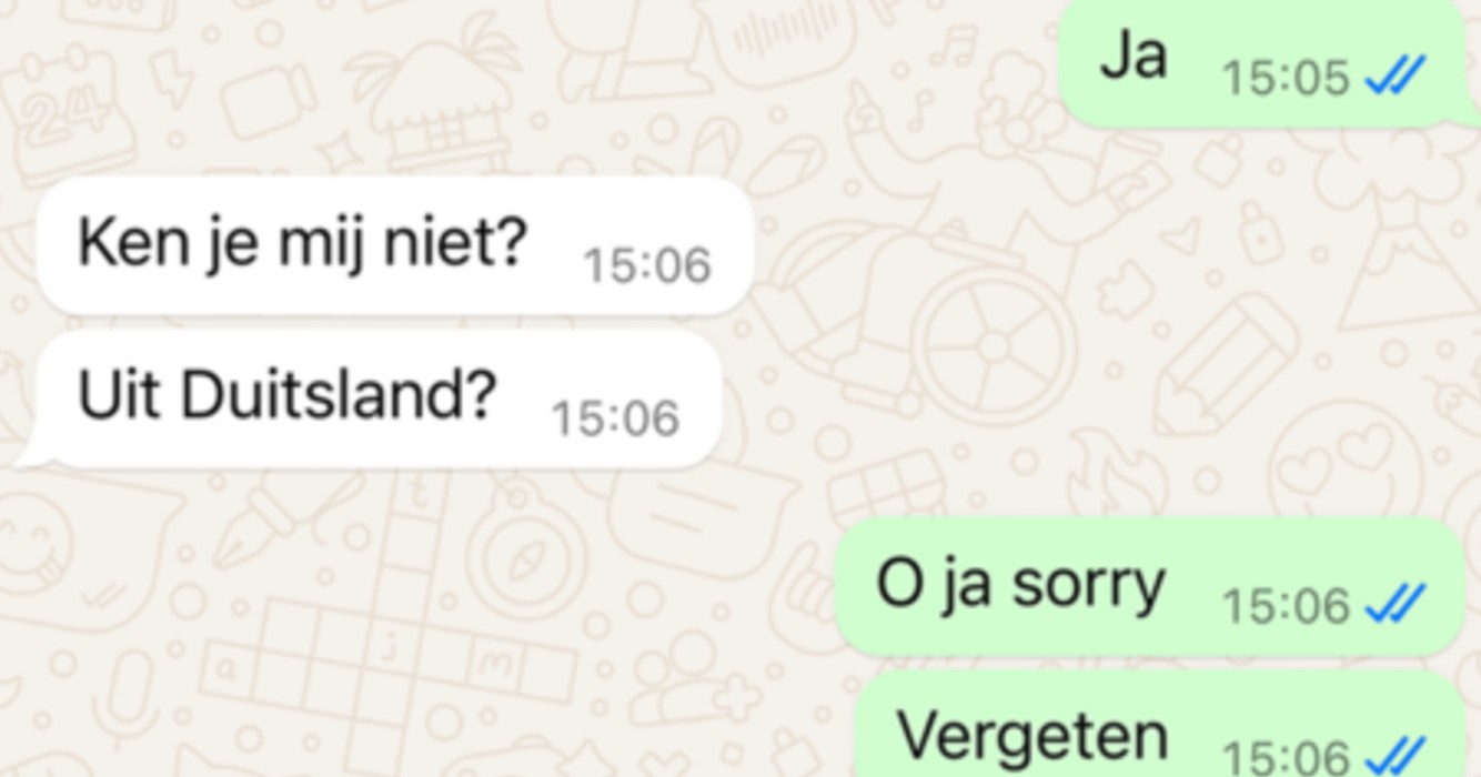 Hoewel deze situatie eindigde in een lachwekkend gesprek, laat het goed zien hoe de Duitse oplichter te werk gaat. Ze bouwen via apps zoals WhatsApp of Facebook Messenger een band op en proberen hun slachtoffers te laten geloven dat ze iemand van vroeger zijn. Pas als het vertrouwen gewonnen is, komt het échte doel naar boven: geld lospeuteren.