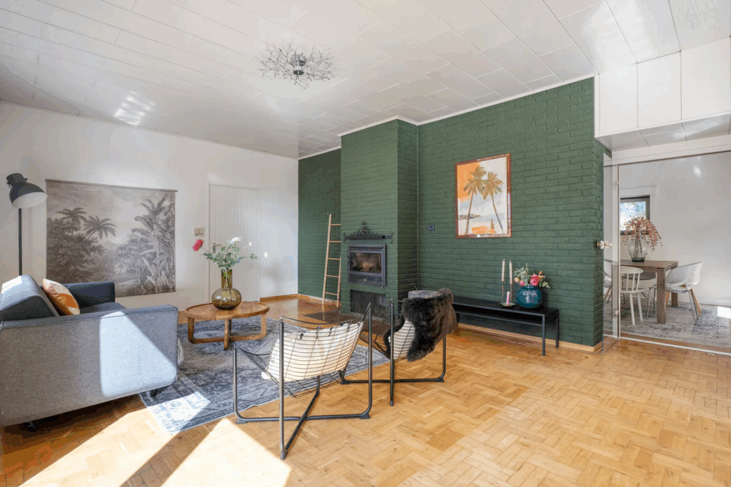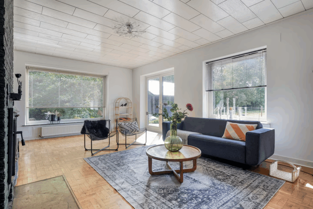 Bij binnenkomst valt direct de warme sfeer op. De woonkamer van circa 30 m² vormt het hart van de woning en beschikt over een parketvloer, houtkachel en openslaande deuren met uitzicht op het groene buitengebied. De aangrenzende eetkamer en de ruime woonkeuken zijn perfect voor gezellige avonden met familie of vrienden.