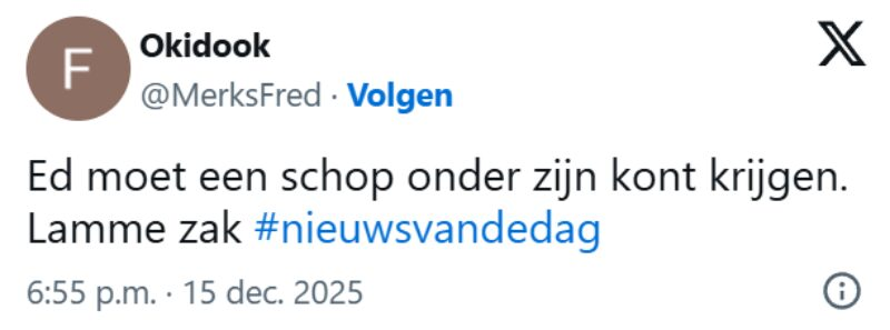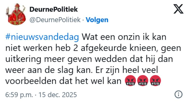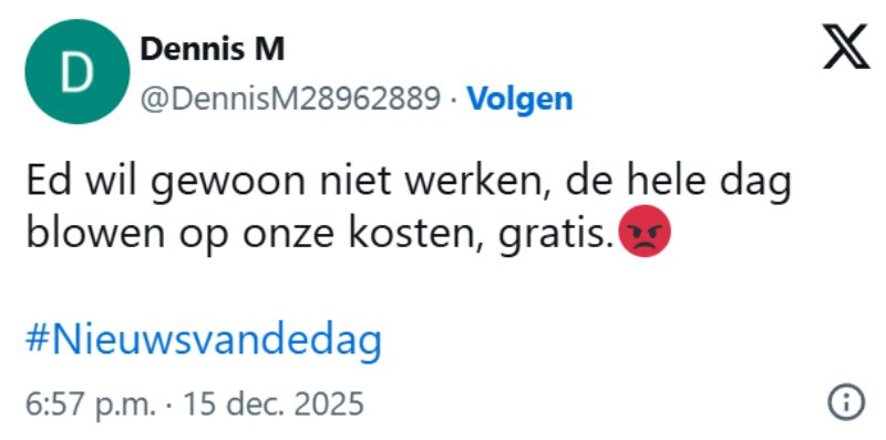 Jaren geleden werd Ed afgekeurd vanwege knieproblemen en psychische klachten. Sindsdien leeft hij van een uitkering van ongeveer 1200 euro per maand. In het interview laat hij weten geen behoefte te hebben om weer te gaan werken. Juist die laconieke houding leidde tot woede. Reacties als “Ed wil gewoon niet werken, de hele dag blowen op onze kosten, gratis 😡” en “Pfff en dat betalen wij!” werden massaal gedeeld onder de hashtag #nieuwsvandag.