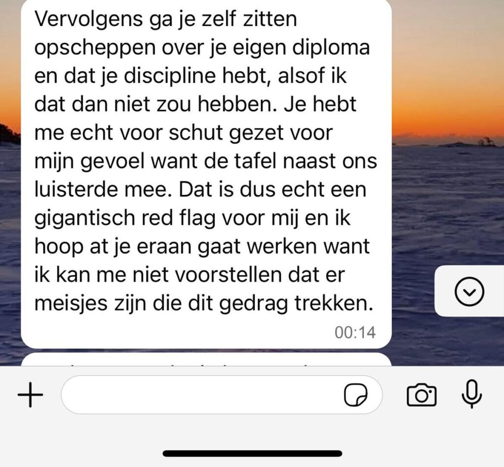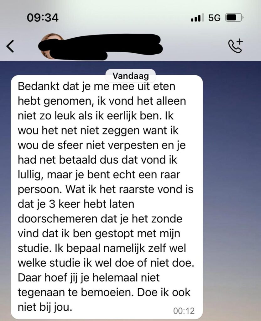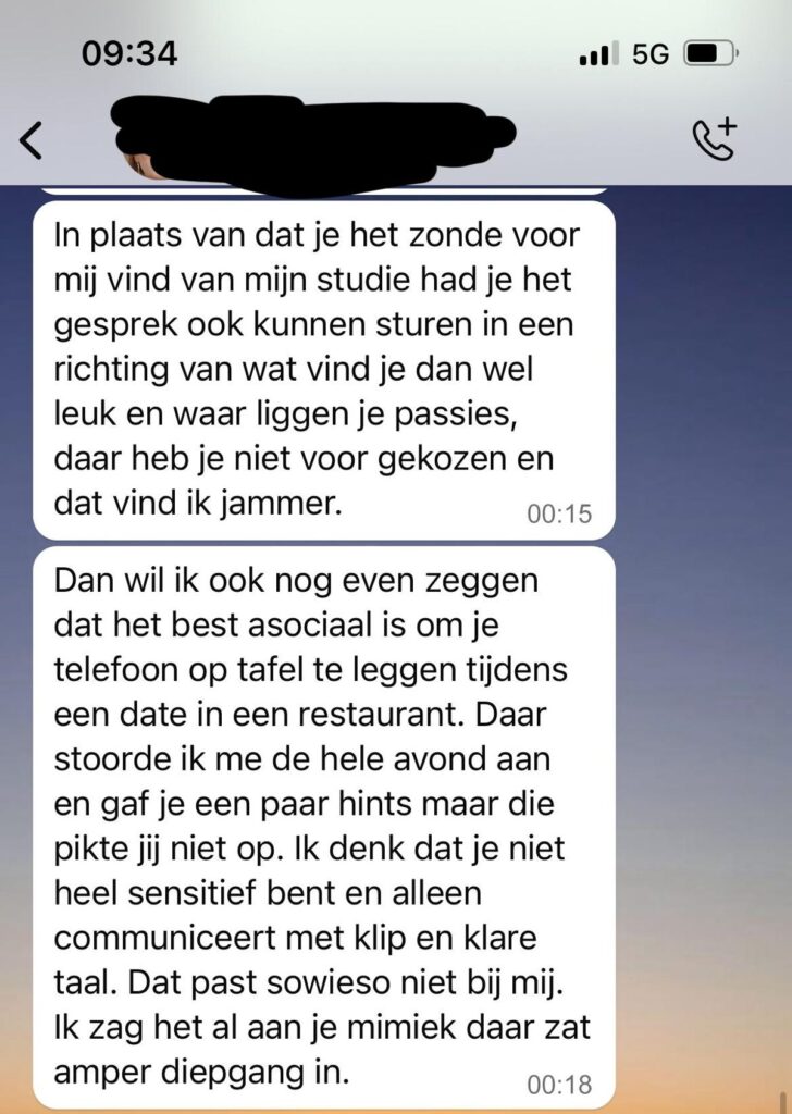 Wat voor de man in kwestie slechts een wat saaie date leek, veranderde later op de avond in een uitgebreid bericht vol kritiek. De dame met wie hij uit eten ging, stuurde hem namelijk een lange WhatsApp-analyse over alles wat volgens haar misging. Ze bedankte hem eerst voor het etentje. Direct daarna gaf ze aan dat ze het eigenlijk helemaal niet leuk had gevonden.