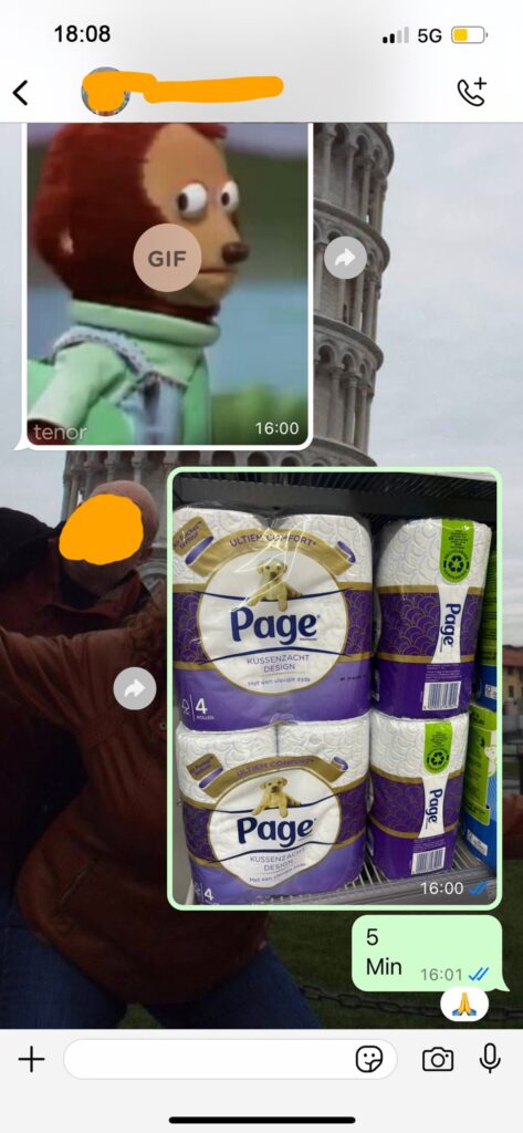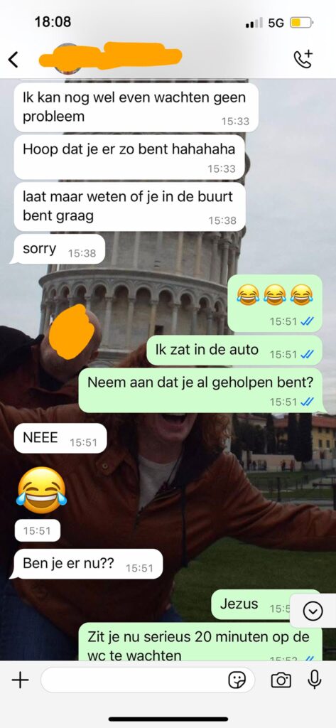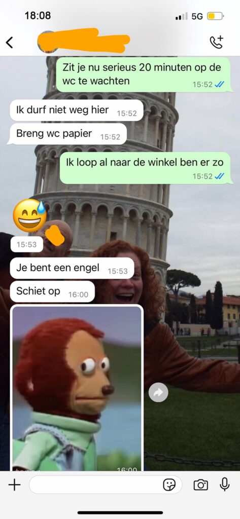 De berichten begonnen onschuldig met een “Hey, ben jij toevallig alweer terug op kantoor?”. Al snel volgde de noodkreet: “Ik zit met een gigantisch probleem 😮.” Toen de collega eindelijk durfde toe te geven wat er aan de hand was, barstte de lach los: ze zat vast op het toilet zonder wc-papier. “Als je er bent, wil je dan wc-papier brengen 😅,” schreef ze wanhopig. De rest van het gesprek is een komische aaneenschakeling van emoji’s, spraakoproepen en herhaalde smeekbedes als “Ik durf niet weg hier” en “Breng wc-papier!”.