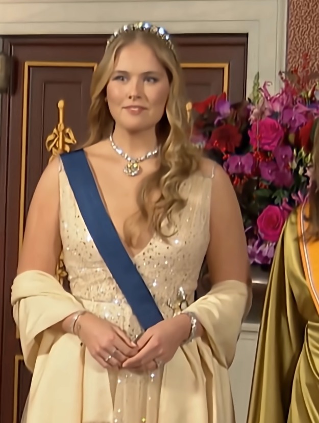 Tijdens het officiële diner, dat werd bijgewoond door koning Willem-Alexander en koningin Máxima, droeg Amalia een stijlvolle jurk met een duidelijke, lagere halslijn dan het publiek van haar gewend is. De outfit werd compleet gemaakt met een blauwe sjerp en een diadeem, wat zorgde voor een klassieke maar toch moderne uitstraling.