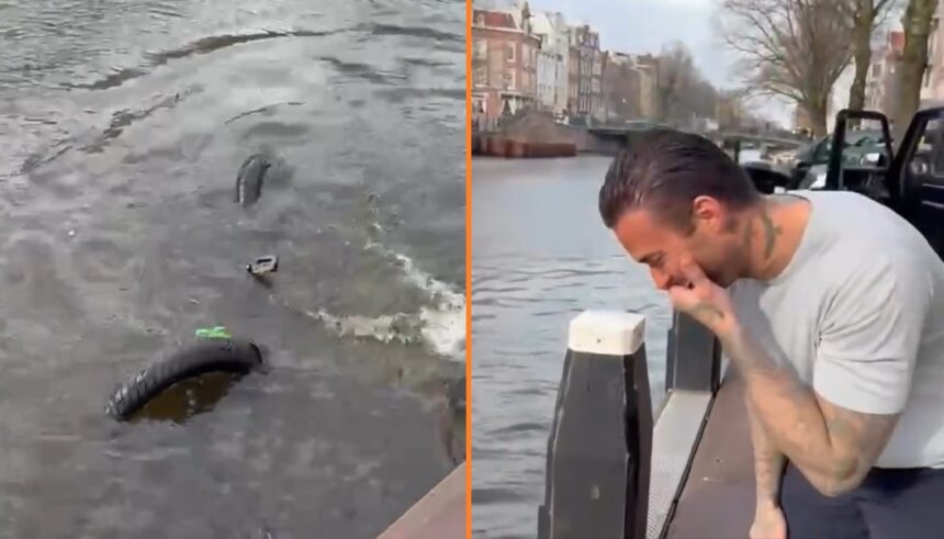 In de nieuwste beelden is te zien hoe de fatbike in een Amsterdamse gracht ligt. Een wiel steekt boven het water uit. Pieter stapt het water in om de fiets te pakken, terwijl Dave op de kade staat en roept: “Pak hem Pieter 😂😂”.
