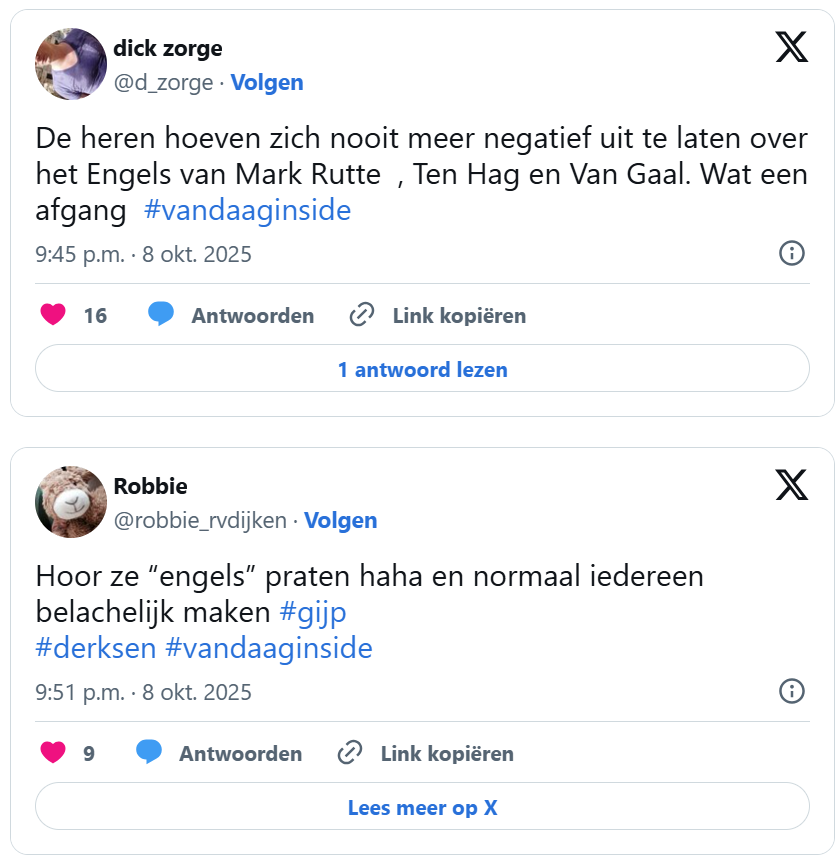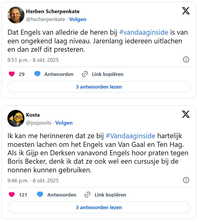 De reacties waren keihard maar ook komisch. “De heren hoeven zich nóóit meer druk te maken over het Engels van Mark Rutte of Erik ten Hag,” schreef iemand. Een ander grapte: “Als ik Gijp en Derksen hoor praten, dan is een cursusje bij de nonnen in Vught geen overbodige luxe.”