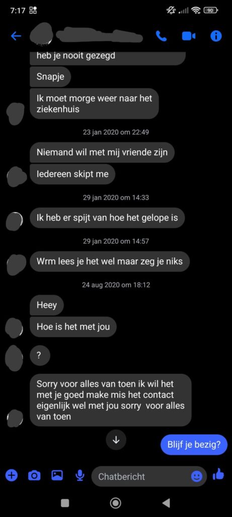Hoewel de vrouw herhaaldelijk en duidelijk liet weten geen interesse te hebben, bleef de man hopen. Hij reageerde op haar korte afwijzingen met nieuwe pogingen, vaak maanden of zelfs jaren later. Zelfs een botte “Ik was je allang al weer vergeten” bracht hem niet van zijn stuk. Met steeds opnieuw dezelfde insteek – dat hij het contact mist – probeerde hij via vriendelijke, soms verontschuldigende woorden haar toch weer tot een gesprek te verleiden. Maar ondanks de voortdurende afwijzing bleef de man doorgaan, wat voor buitenstaanders zowel tragisch als fascinerend is.
