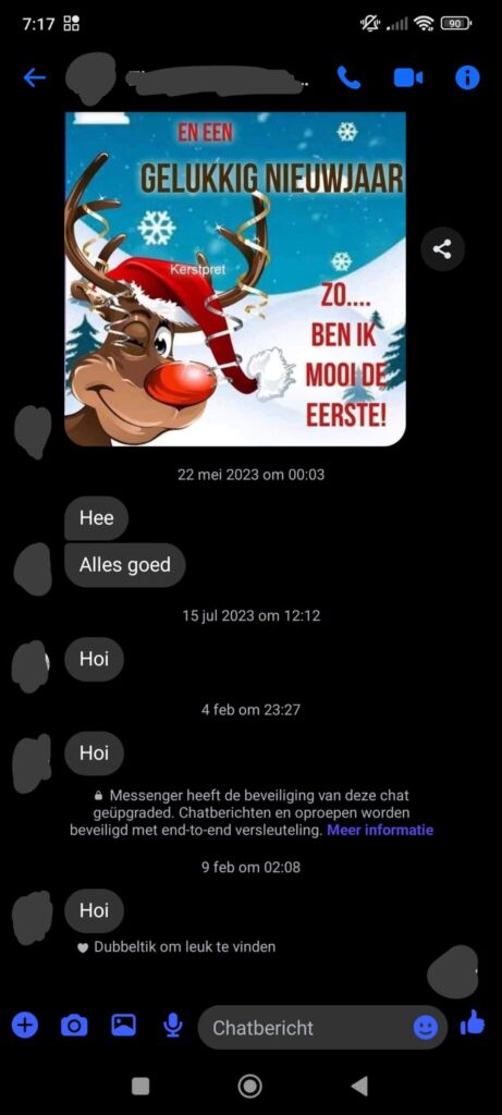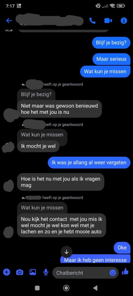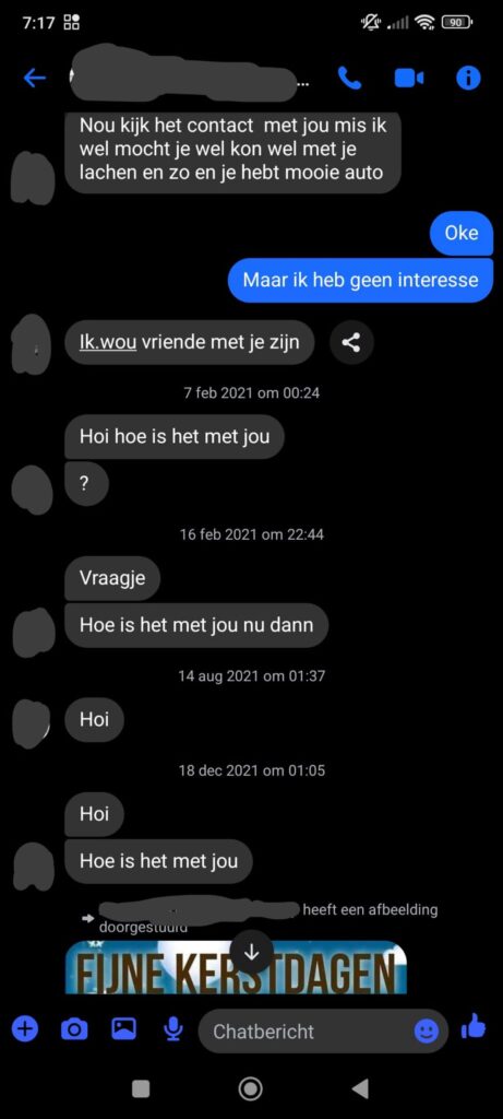 Sommige mensen nemen een afwijzing moeilijk, maar deze persoon sloeg werkelijk alles. Al sinds 2019 stuurt hij – ondanks duidelijke signalen – berichten naar een vrouw die hem al lang en breed heeft laten weten dat er geen wederzijdse interesse is. Van “Mooie auto heb je” tot “Hoe is het met jou?”, het patroon is helder: hij zoekt contact, zij wijst dat contact herhaaldelijk af.