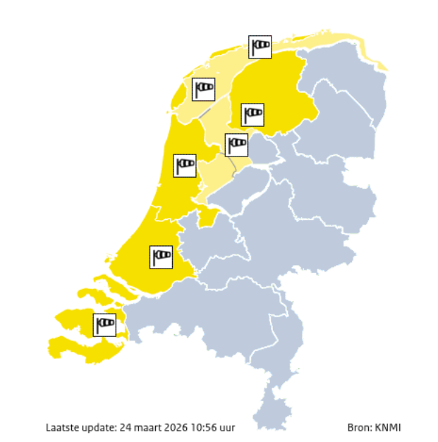 Ook het KNMI waarschuwt inmiddels voor extra onstuimig weer. Voor morgen geldt in de kustprovincies Code Geel vanwege zware windstoten. Volgens het KNMI kunnen daar vooral tijdens buien windstoten voorkomen van 75 tot 90 kilometer per uur. In het noordwestelijk kustgebied zijn lokaal zelfs uitschieters tot 90 à 100 kilometer per uur mogelijk. Het weerinstituut waarschuwt dat verkeer en buitenactiviteiten daar hinder van kunnen ondervinden.