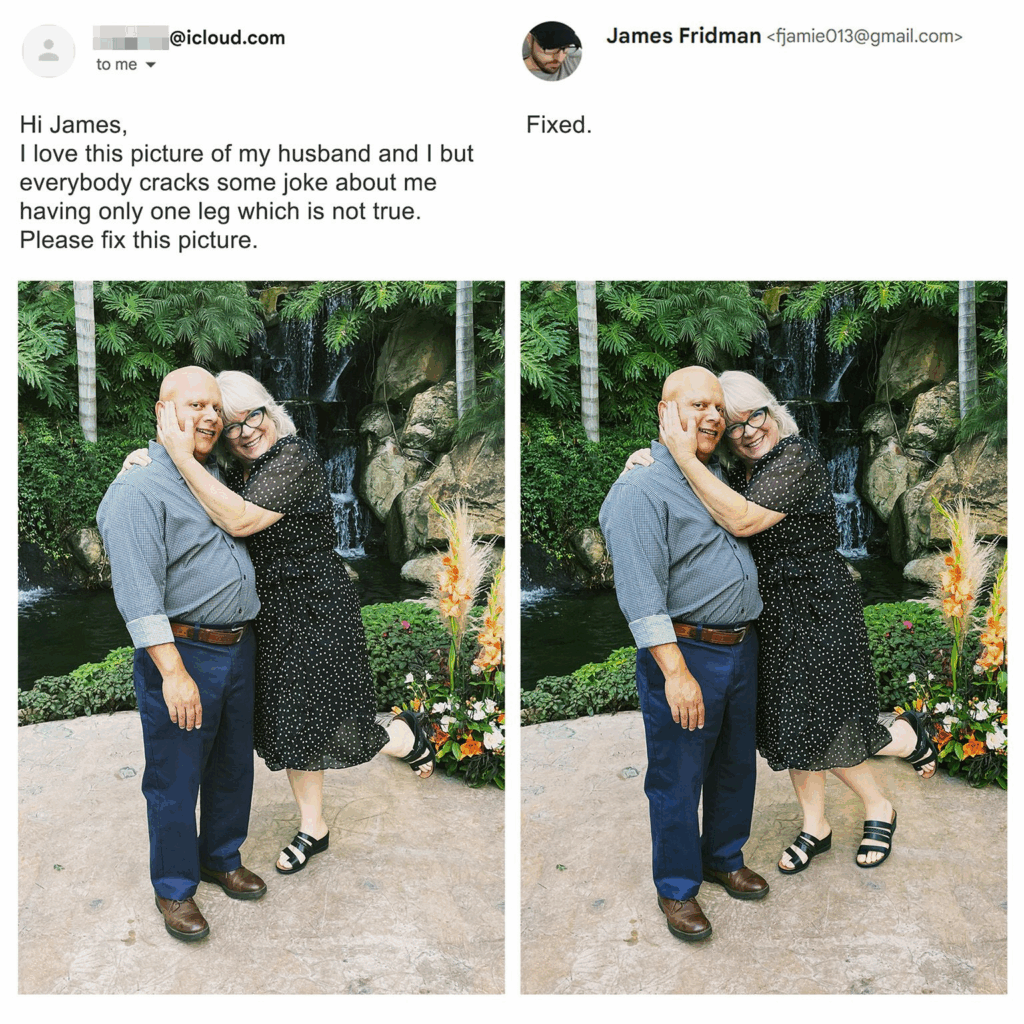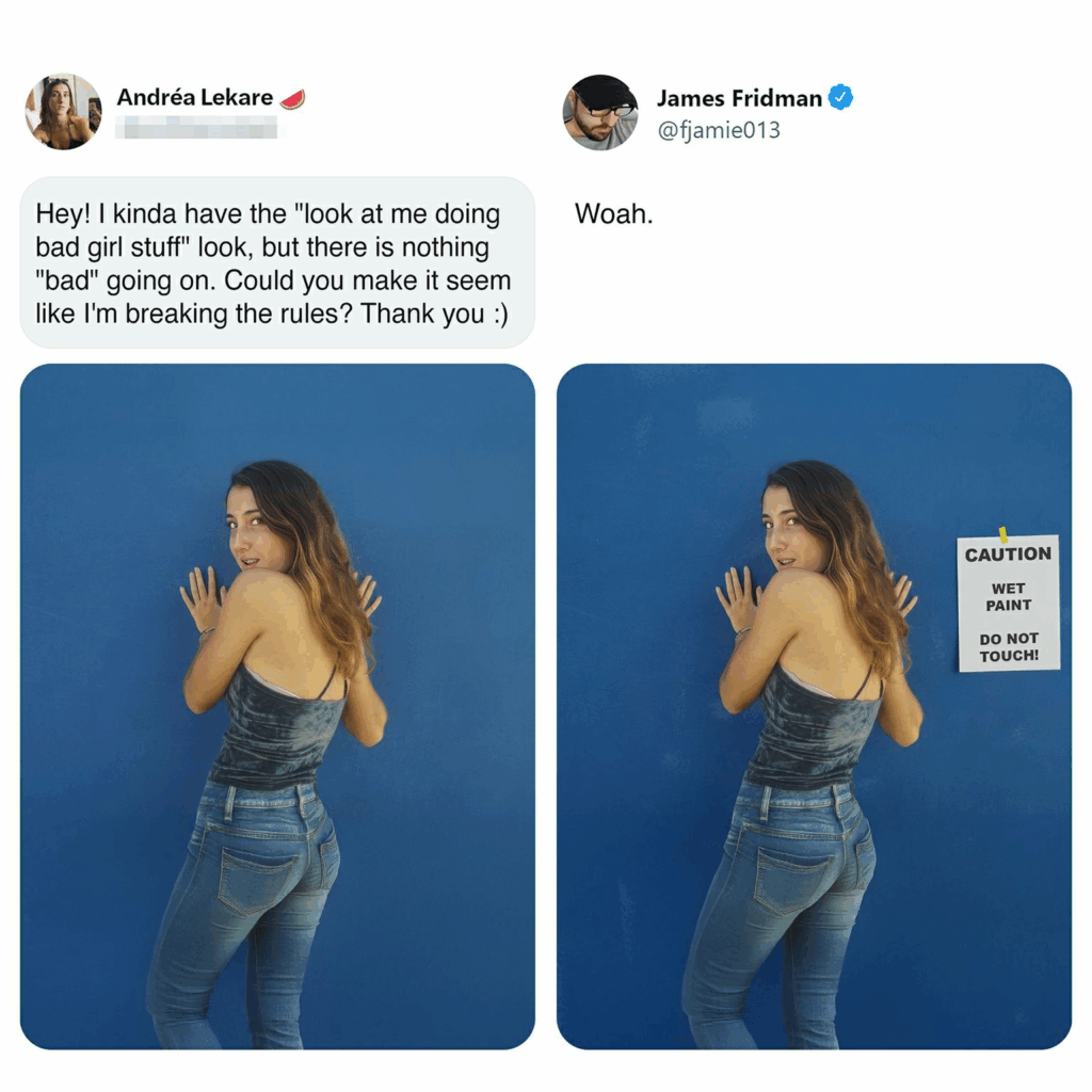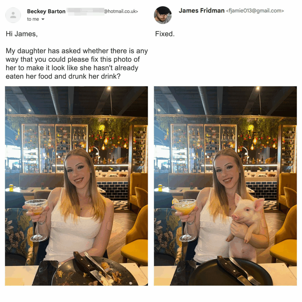 James Fridman is terug met een nieuwe lading briljant bewerkte foto’s, en wederom heeft hij het internet laten huilen van het lachen. De Britse Photoshop-goeroe staat bekend om zijn droge humor en genadeloze letterlijke interpretaties van verzoeken die mensen hem sturen. Vraag je om iets “ietsje kleiner”? Grote kans dat hij je naar dwergformaat verkleint. Wil je dat je ex “verdwijnt” uit de foto? Dan is je hele achtergrond ineens leeg.