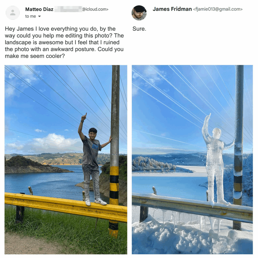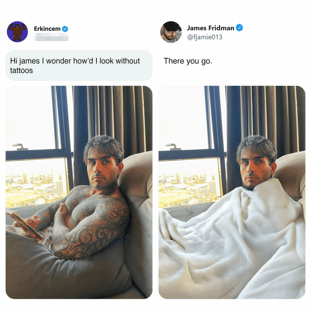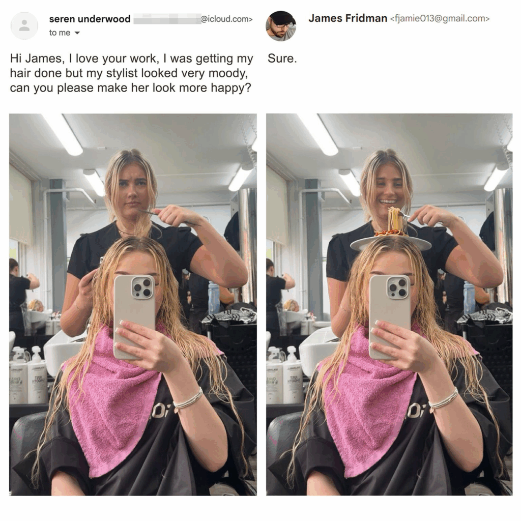 Wat James Fridman zo uniek maakt, is zijn perfecte mix van technische fotobewerkingsskills en vlijmscherpe humor. James Fridman verandert gênante situaties in meesterlijke satire, en geeft mensen soms ook onverwacht een wijze les. In de nieuwste selectie laat hij iemand letterlijk “op wolken lopen”, maakt hij van een strandfoto een scène in een zwembad vol dolfijnen, en verandert hij een hoodie in een echte kap op iemands hoofd. De resultaten zijn altijd absurd én geniaal.
