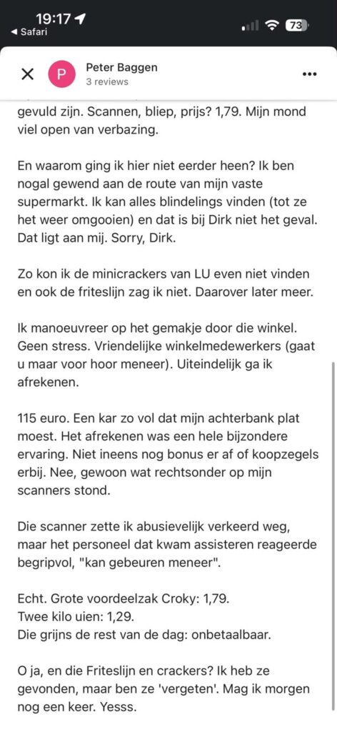 De Dirk in Spijkenisse staat plots volop in de belangstelling nadat een uitgebreide en humoristische review van een klant, Peter, massaal wordt gedeeld op social media. In zijn verhaal beschrijft hij hoe hij aanvankelijk sceptisch was om speciaal een stukje te rijden voor boodschappen, maar al snel compleet verrast werd door de prijzen en de winkelervaring. “Ik dacht: zoveel zal het niet schelen, maar na de eerste schappen kreeg ik de grijns niet meer van mijn gezicht,” schrijft hij.